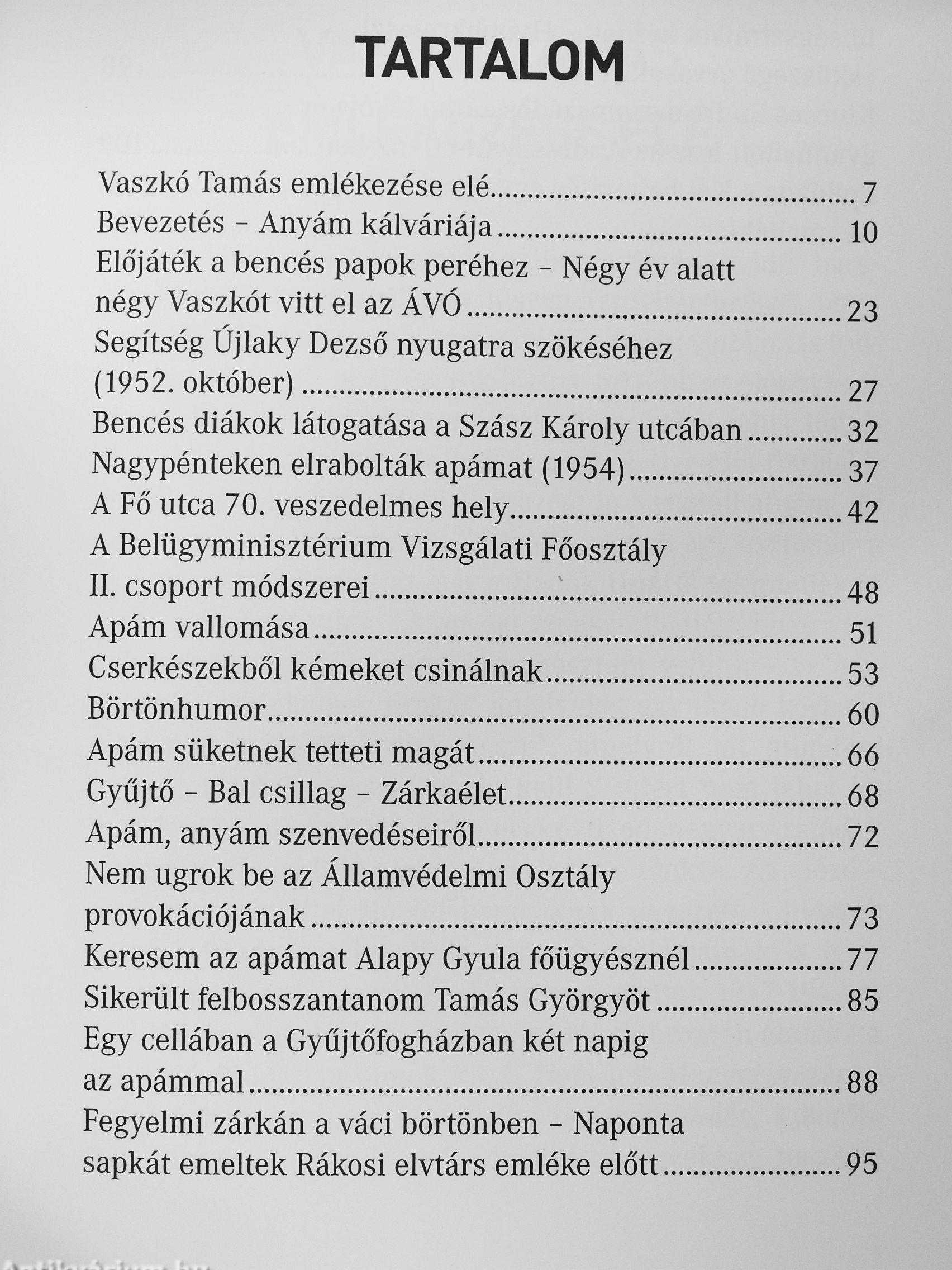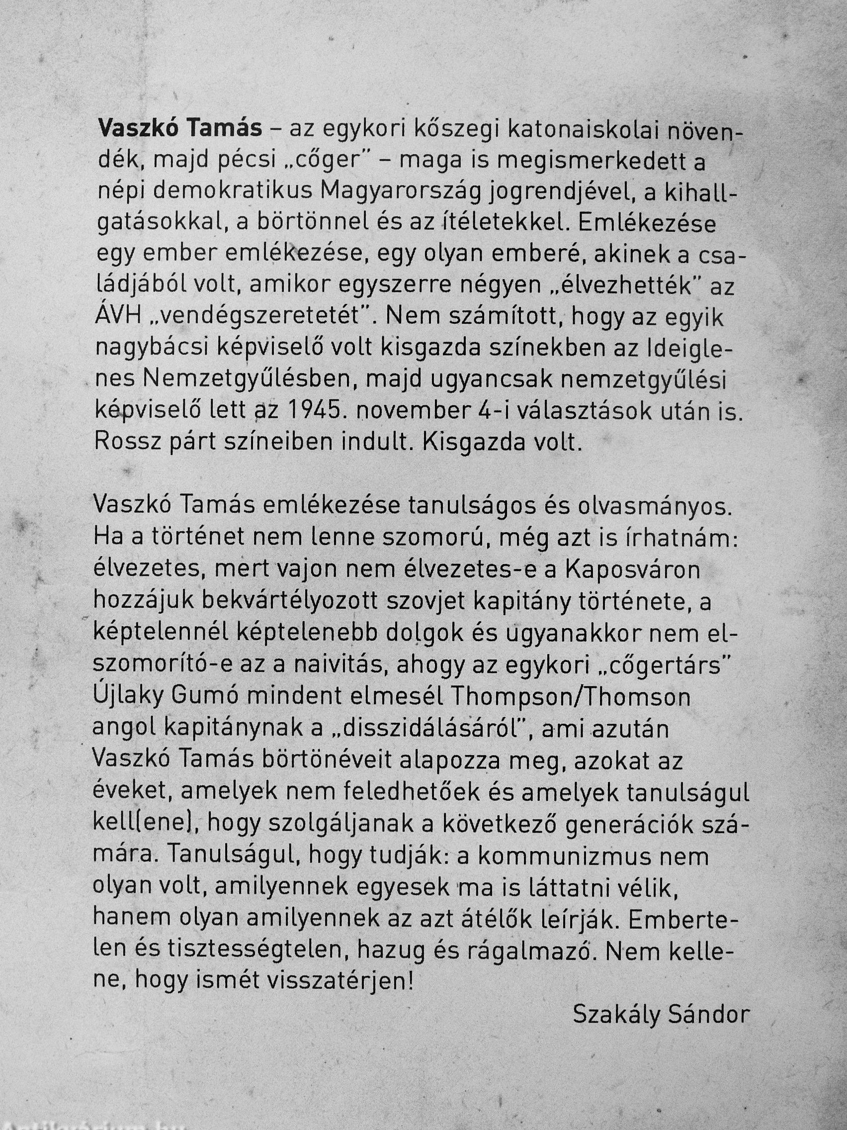 Vaszkó Tamás emlékezése tanulságos és olvasmányos. Ha a történet nem lenne szomorú, még azt is írhatnám: élvezetes, mert vajon nem élvezetes-e a Kaposváron hozzájuk bekvártélyozott szovjet kapitány története, a képtelennél képtelenebb dolgok és ugyanakkor nem el-szomorító-e az a naivitás, ahogy az egykori „cőgertárs" Újlaky Gumó mindent elmesél Thompson/Thomson angol kapitánynak a „disszidálásáról", ami azután Vaszkó Tamás börtönéveit alapozza meg, azokat az éveket, amelyek nem feledhetőek és amelyek tanulságul keU(ene), hogy szolgáljanak a következő generációk számára. Tanulságul, hogy tudják: a kommunizmus nem olyan volt, amilyennek egyesek ma is láttatni vélik, hanem olyan amilyennek az azt átélők leírják. Embertelen és tisztességtelen, hazug és rágalmazó. Nem kellene, hogy ismét visszatérjen!