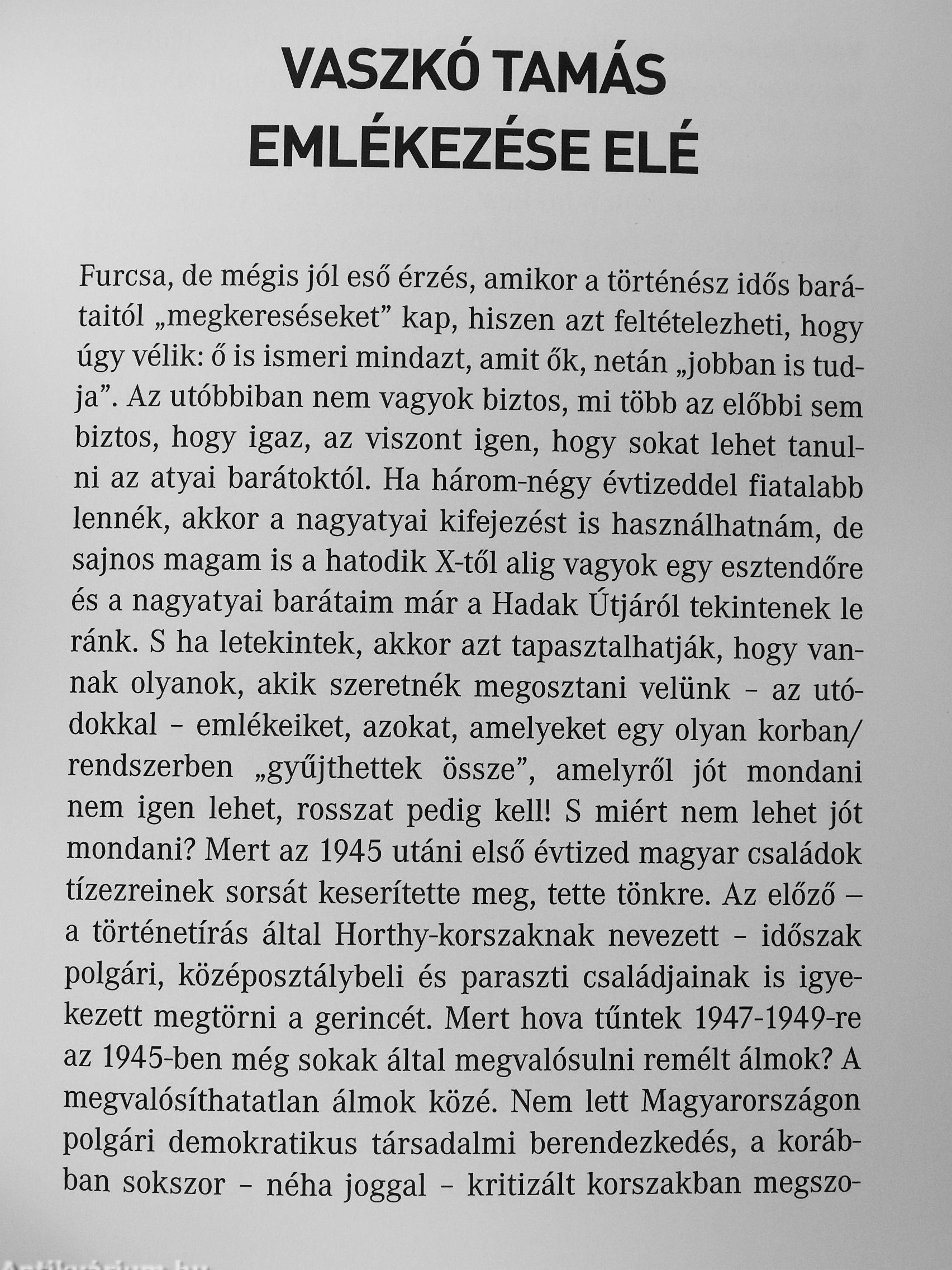 Vaszkó Tamás - az egykori kőszegi katonaiskolai növendék, nnajd pécsi „cőger" - maga is megisnnerkedett a népi dennokratikus Magyarország jogrendjével, a kihallgatásokkal, a börtönnel és az ítéletekkel. Emlékezése egy ember emlékezése, egy olyan emberé, akinek a családjából volt, amikor egyszerre négyen „élvezhették" az ÁVH „vendégszeretetét". Nem számított, hogy az egyik nagybácsi képviselő volt kisgazda színekben az Ideiglenes Nemzetgyűlésben, majd ugyancsak nemzetgyűlési képviselő lett az 1945. november 4-i választások után is. Rossz párt színeiben indult. Kisgazda volt.