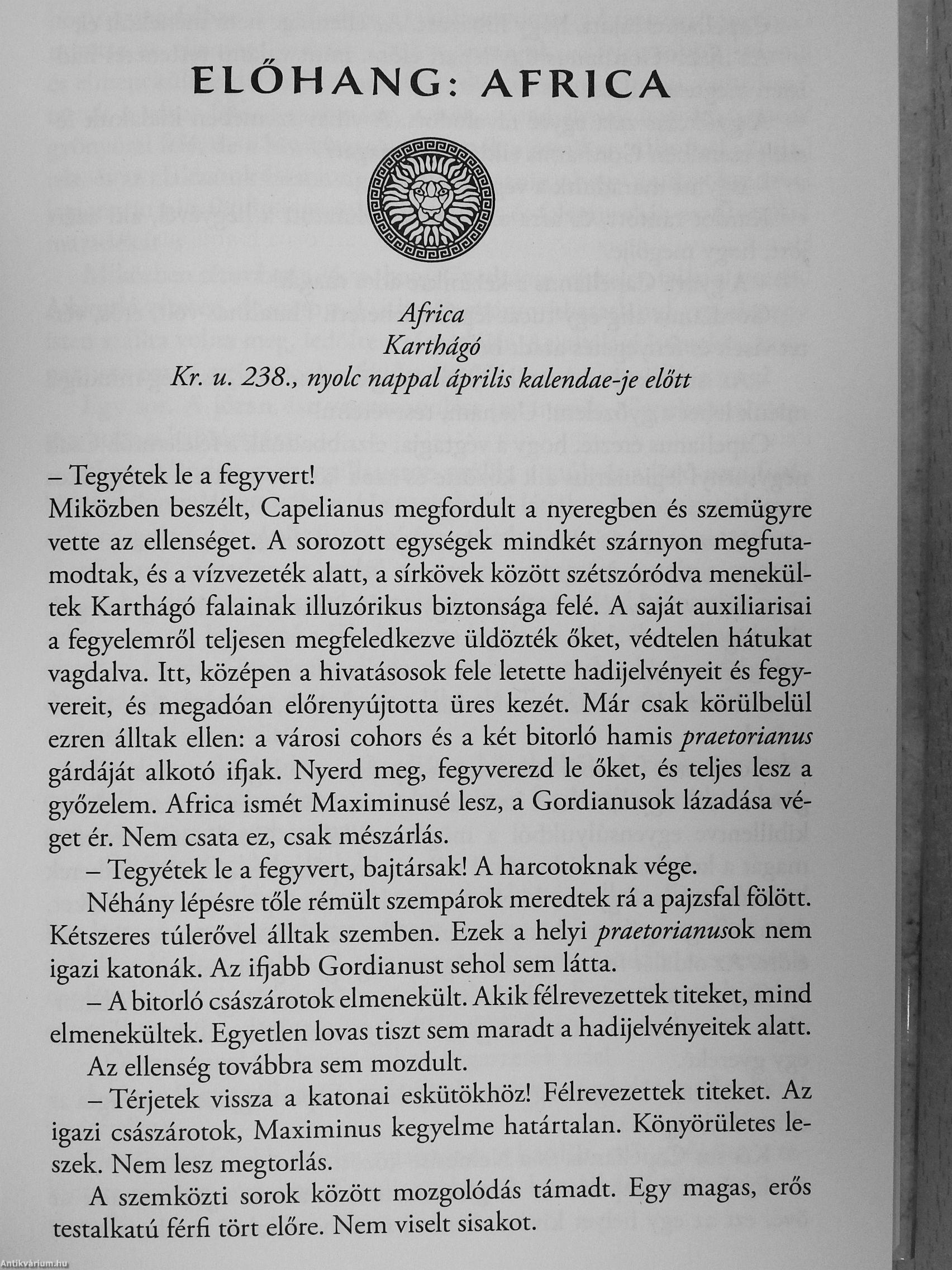 Africában az idősebb és az i^abb Gor-dianust kiáltják ki Augustusnak. Az uralkodói vérvonalból származó apa és fia esélyt jelent a régi arisztokráciának, hogy visszaszerezze a biroda.lmat."^