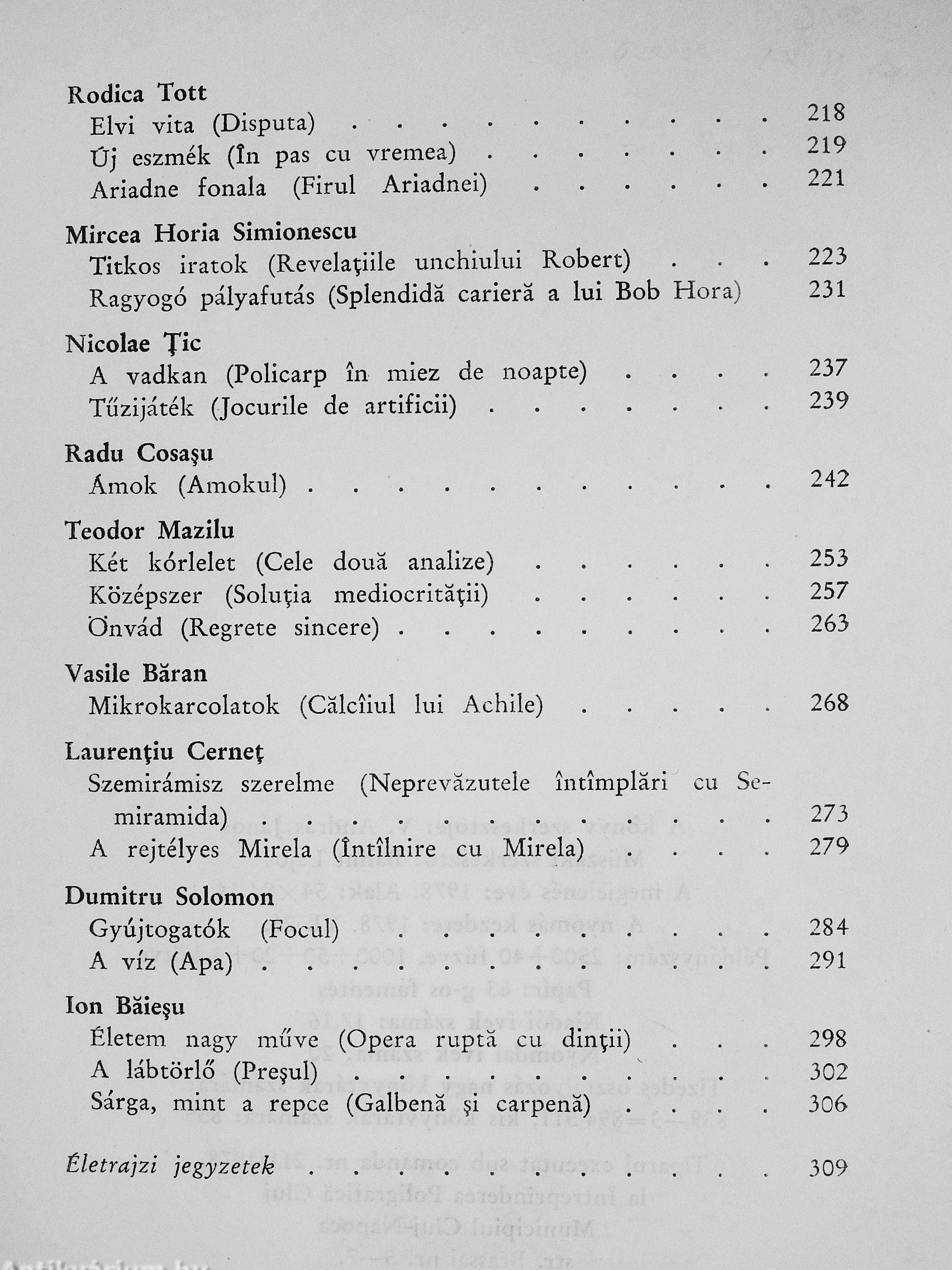 A humor magában a nyelvben él, tőle elválaszthatatlan, következésképp átültetése óhatatlan veszteségekkel jár, olykor a sajátos ízek megcsappanásával. Mi több, akadnak olyan írások is, amelyeknek nyelvi humora elsorvad a tolmácsolásban, s ezekről le kel mondani, bármennyire értékesek is. így hát e kötet válogatása — hangsúlyosabban, mint más antológiák esetében — épp-pen a sajátos nyelvi korlátok miatt a román humoros írások egyik „lehetséges" gyűjteménye. Ám magyar olvasó így is élvezetes ajándékot kap a román humoros-szatirikus próza kincstárából.