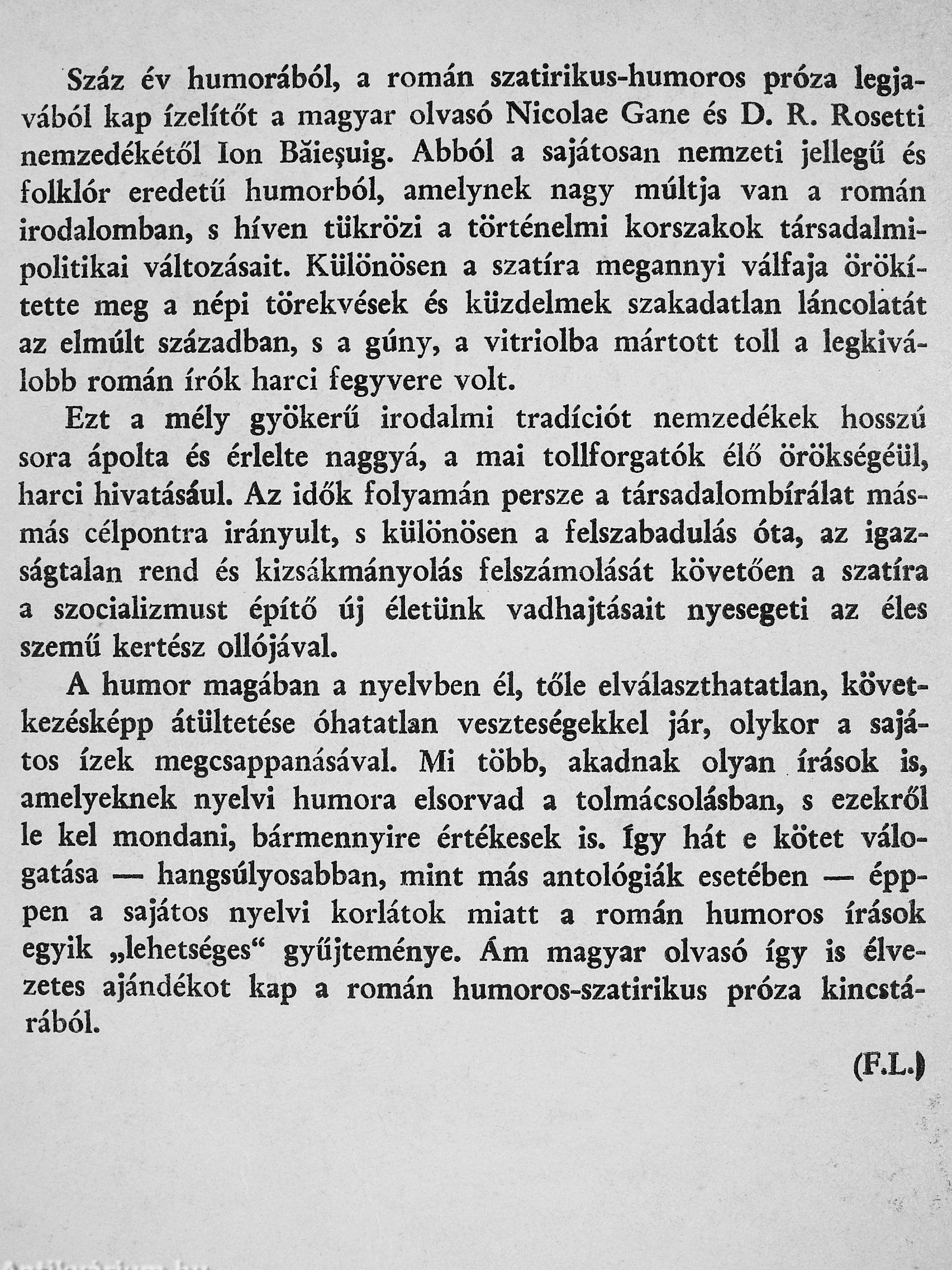Száz év humorából, a román szatirikus-humoros próza legjavából kap ízelítőt a magyar olvasó Nicolae Gane és D. R. Rosetti nemzedékétől Ion Báie§uig. Abból a sajátosan nemzeti jellegű és folklór eredetű humorból, amelynek nagy múltja van a román irodalomban, s híven tükrözi a történelmi korszakok társadalmipolitikai változásait. Különösen a szatíra megannyi válfaja örökítette meg a népi törekvések és küzdelmek szakadatlan láncolatát az elmúlt században, s a gúny, a vitriolba mártott toll a legkiválóbb román írók harci fegyvere volt.