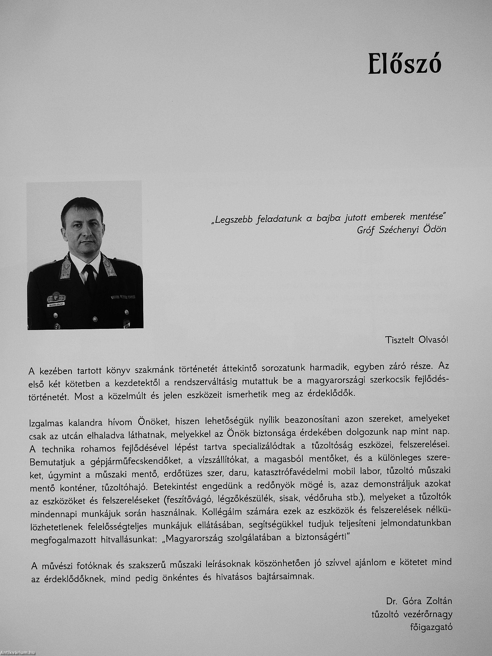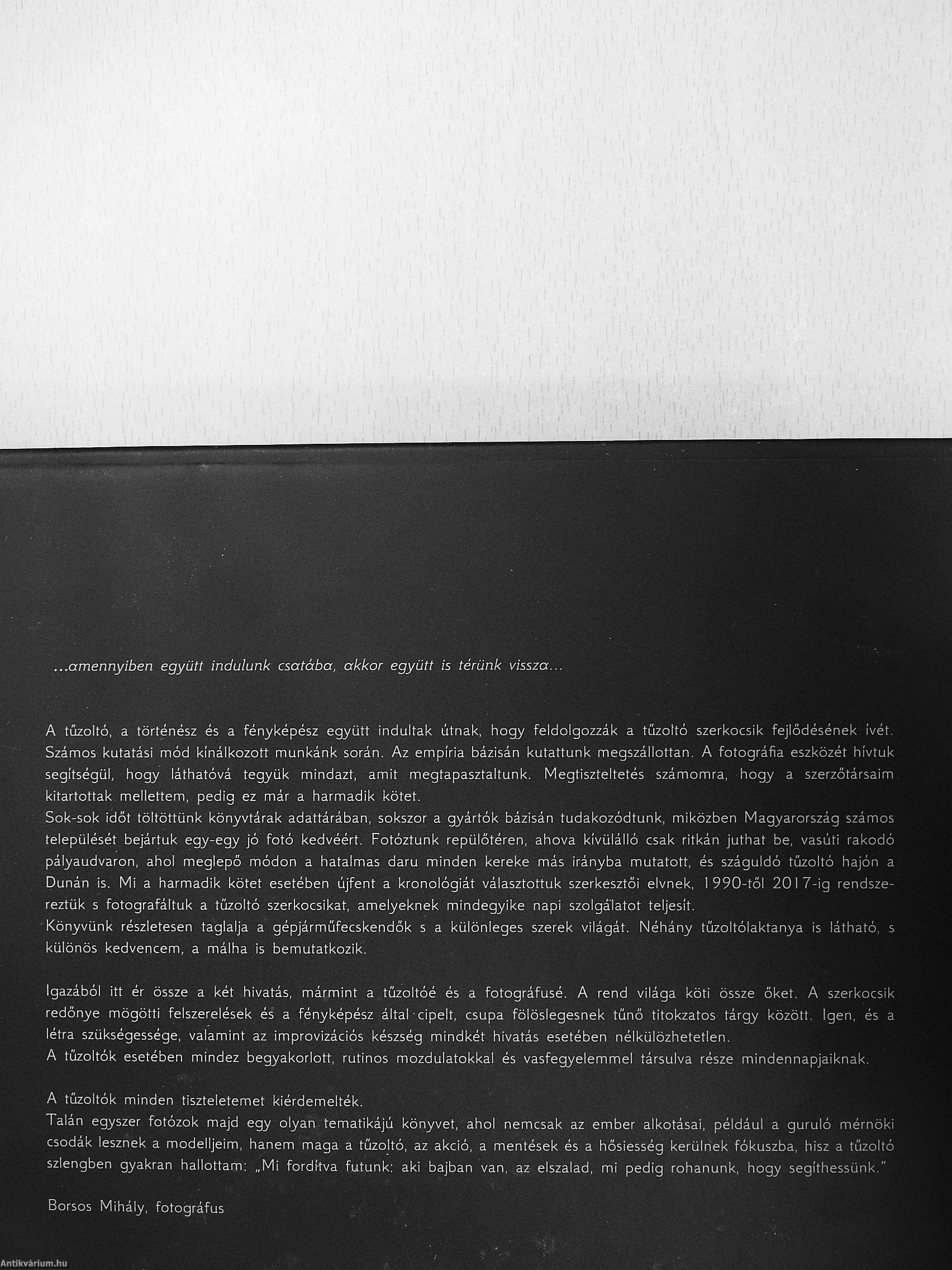 A tűzoltó, a történész és a fényképész együtt indultak útnak, hogy feldolgozzák a tűzoltó szerkocsik fejlődésének Ivét. Számos kutatási mód kínálkozott munkánk során. Az empíria bázisán kutattunk megszállottan. A fotográfia eszközét hívtuk segítségül, hogy láthatóvá tegyük mindazt, amit megtapasztaltunk. Megtiszteltetés számomra, hogy a szerzőtársaim kitartottak, mellettem, pedig ez már a harmadik kötet.