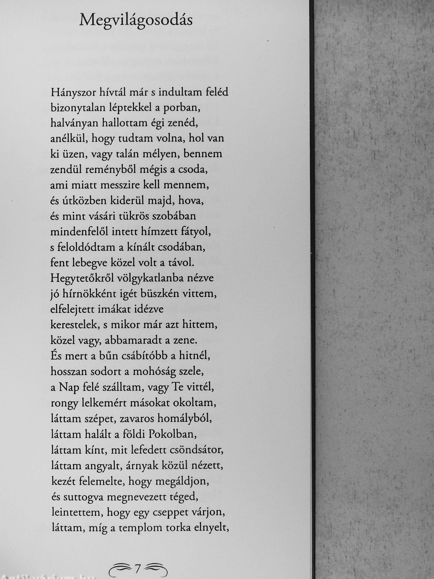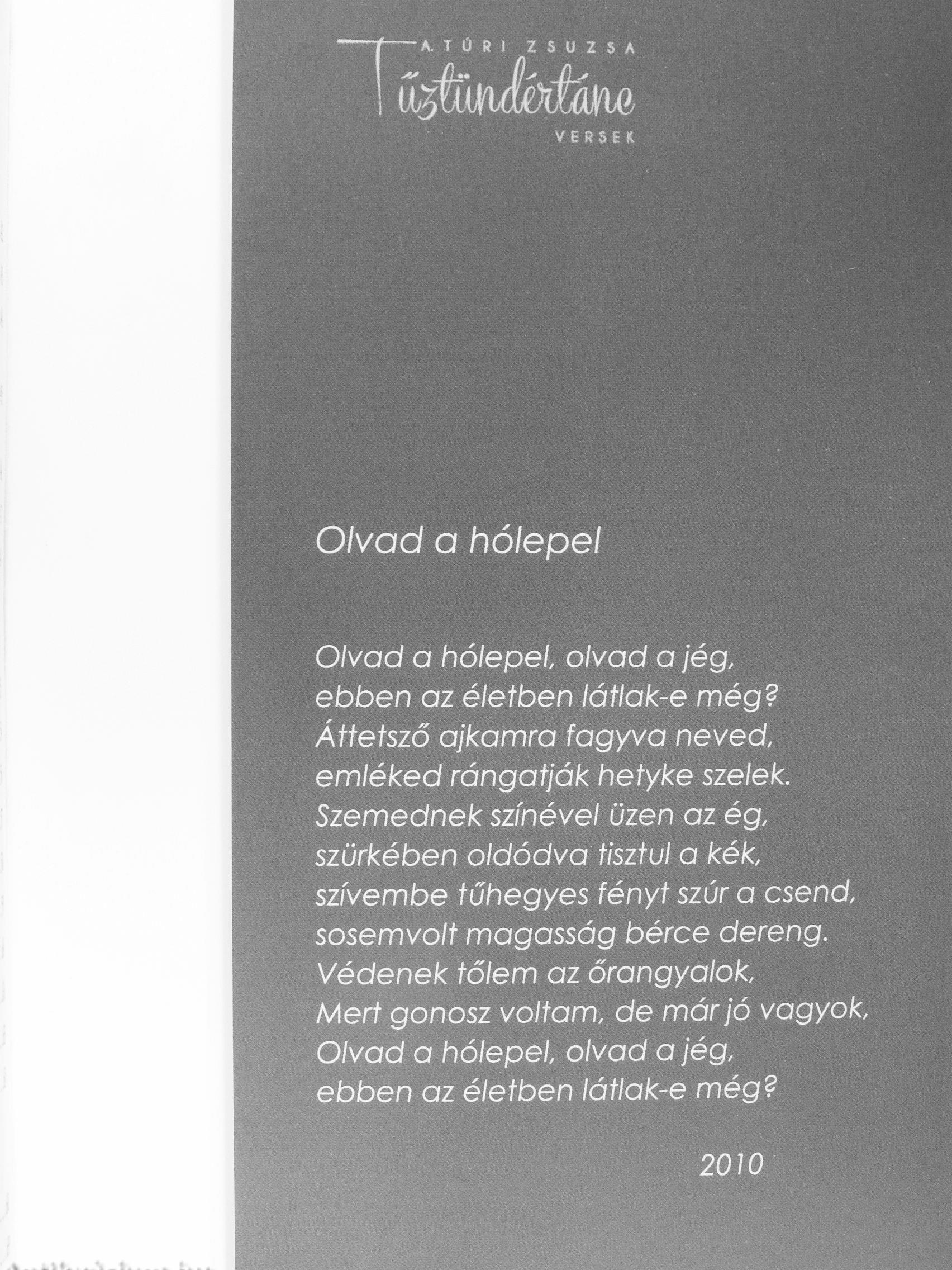 Olvad a hólepel, olvad a jég, ebben az életben láfiak-e még? Áttetsző ajkamra fagyva neved, emléked rángatják hetyke szelek. Szemednek színével üzen az ég, szürkében oldódva tisztul a kék, szívembe tűhegyes fényt szúr a csend, sosemvolt magasság bérce dereng. Védenek tőlem az őrangyalok. Mert gonosz voltam, de már jó vagyok. Olvad a hólepel, olvad a jég, ebben az életben látlak-e még?