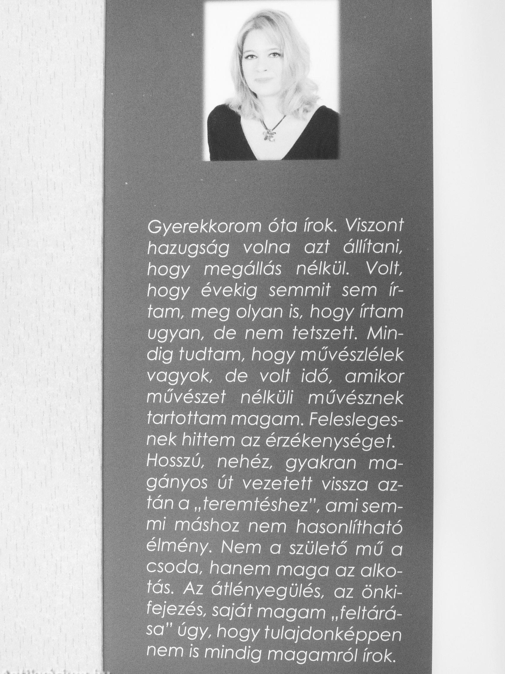 tartottam magam. Feleslegesnek hittem az érzékenységet. Hosszú, nehéz, gyakran magányos út vezetett vissza aztán a „teremtéshez", ami semmi máshoz nem hasonlítható élmény. Nem a születő mű a csoda, hanem maga az alkotás. Az átlényegülés, az önkifejezés, saját magam Jeltárása" úgy, hogy tulajdonképpen nem is mindig magamról írok.