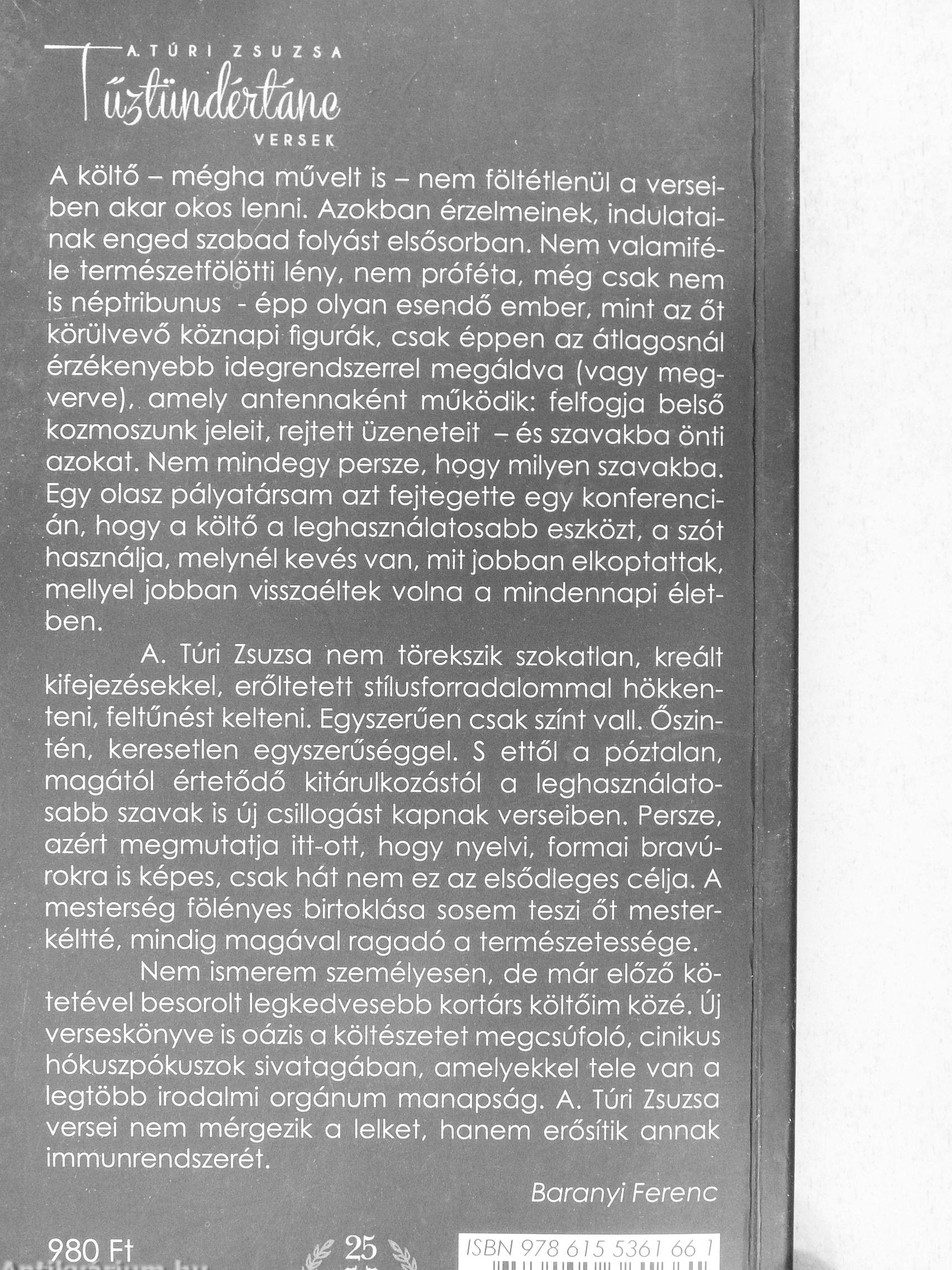 Nem ismerem személyesen, de már előző kö- tí tetével besorolt legkedvesebb kortárs költőim közé. Új verseskönyve is oázis a költészetet megcsúfoló, cinikus hókuszpókuszok sivatagában, amelyekkel tele van a legtöbb irodalmi orgánum manapság. A. Túri Zsuzsa versei nem mérgezik a lelket, hanem erősítik annak immunrendszerét.