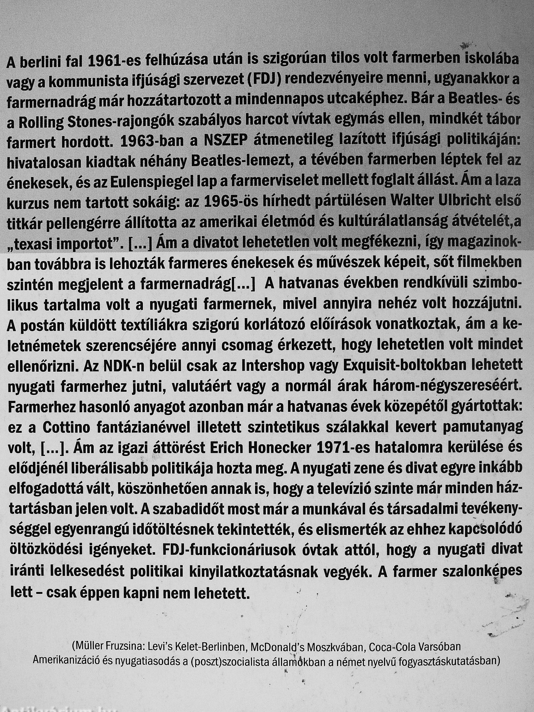 A berlini fai 1961-es feiiiúzása után is szigorúan tilos volt farmerben iskolába vagy a kommunista ifjúsági szervezet (FDJ) rendezvényeire menni, ugyanakkor a farmernadrág már hozzátartozott a mindennapos utcaképhez. Bár a Beatles- és a Roiiing Stones-rajongók szabályos harcot vívtak egymás ellen, mindkét tábor farmert hordott. 1963-ban a NSZEP átmenetileg lazított ifjúsági politikáján: hivatalosan kiadtak néhány Beatles-lemezt, a tévében farmerben léptek fel az énekesek, és az Eulenspiegel lap a farmerviselet mellett foglalt állást. Ám a laza kurzus nem tartott sokáig: az 1965-ös hírhedt pártülésen Walter Ulbricht első titkár pellengérre állította az amerikai életmód és kultúrálatlanság átvételét,a „texasi importot". [ ] Ám a divatot lehetetlen volt megfékezni, így magazinokban továbbra is lehozták farmeres énekesek és művészek képeit, sőt filmekben szintén megjelent a farmernadrág[ ] A hatvanas években rendkívüli szimbolikus tartalma volt a nyugati farmernek, mivel annyira nehéz... Tovább