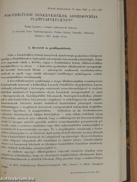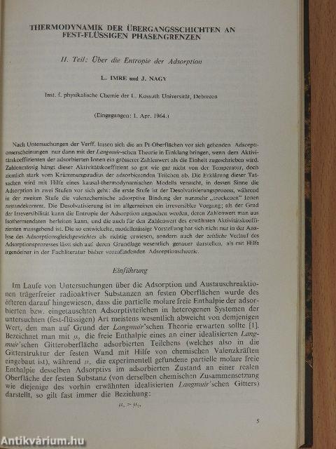 Thermodynamik der Übergangsschichten an Fest-Flüssigen Phasengrenzen/Thermodynamik der Oberflachenprozesse Radioaktiver Substanzen/The Nuclear Chemical Significance of Absolute Radioactive Measuremenets II./ Corrosion Kinetic Studies by the Radioactive Method I./Nagyhígítású ionkeverékek adszorpciója platinafelületen/Mikromennyiségű radioaktív atomfajták együttlecsapásos koncentrálásának és elválasztásának termodinamikai problémái I.