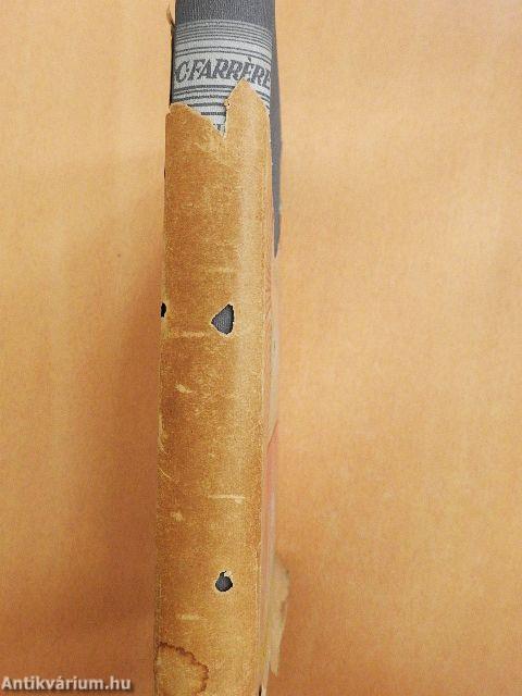 A címlapon tulajdonosi bejegyzés látható. A védőborító hiányos. A borító alsó széle foltos.