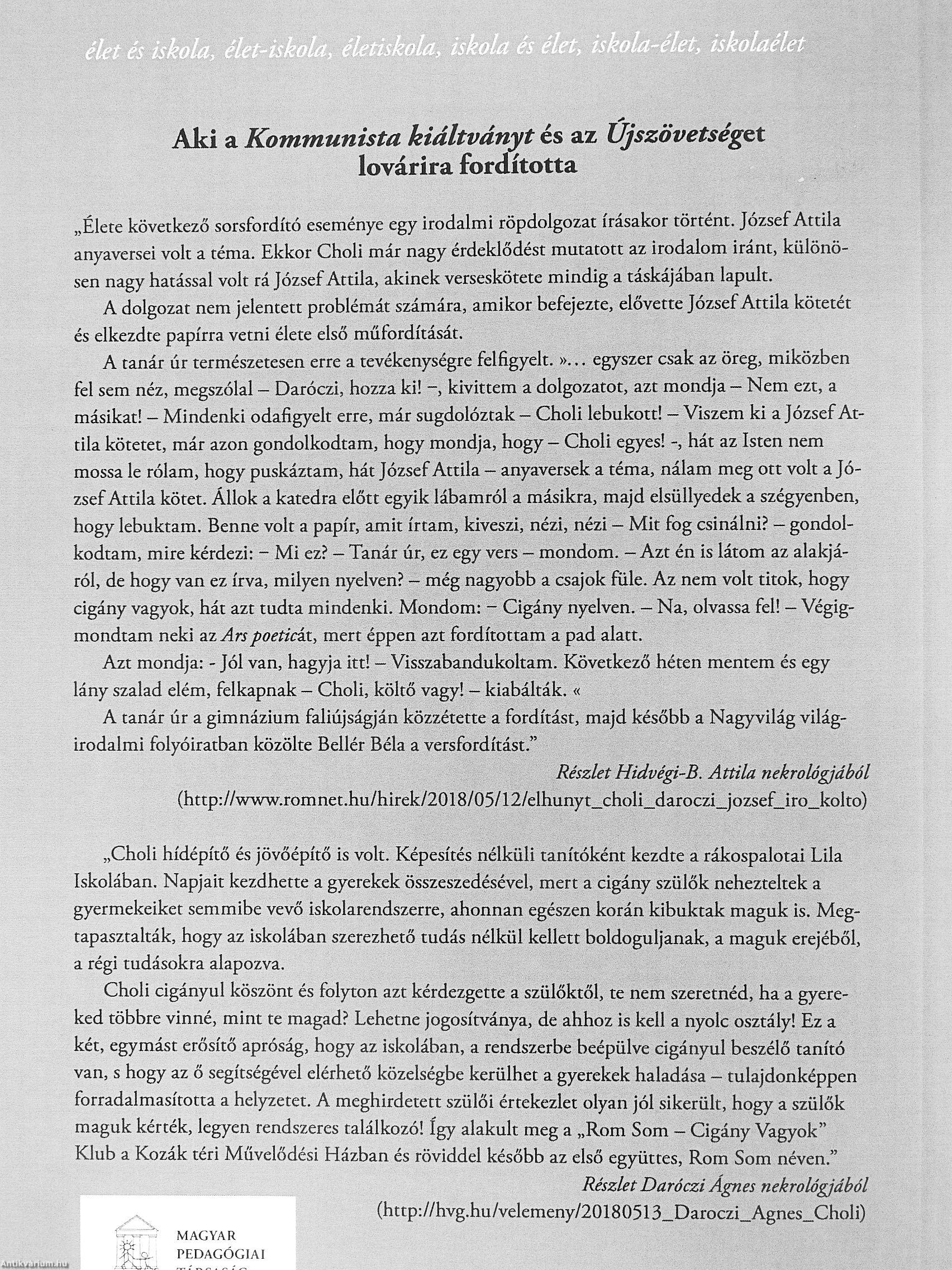 A tanár úr természetesen erre a tevékenységre felfigyelt. » egyszer csak az öreg, miközben fel sem néz, megszólal - Daróczi, hozza ki! -, kivittem a dolgozatot, azt mondja - Nem ezt, a másikat! - Mindenki odafigyek erre, már sugdolóztak - Choli lebukott! - Viszem ki a József Attila kötetet, már azon gondolkodtam, hogy mondja, hogy - Choli egyes! -, hát az Isten nem mossa le rólam, hogy puskáztam, hát József Attila - anyaversek a téma, nálam meg ott vok a József Attila kötet. Állok a katedra előtt egyik lábamról a másikra, majd elsüllyedek a szégyenben, hogy lebuktam. Benne volt a papír, amit írtam, kiveszi, nézi, nézi - Mit fog csinálni? - gondolkodtam, mire kérdezi: - Mi ez? - Tanár úr, ez egy vers - mondom. - Azt én is látom az alakjáról, de hogy van ez írva, milyen nyelven? - még nagyobb a csajok füle. Az nem volt titok, hogy cigány vagyok, hát azt tudta mindenki. Mondom: - Cigány nyelven. - Na, olvassa fel! - Végig-mondtam neki az Ars poeticái, mert éppen azt fordítottam a pad alatt.