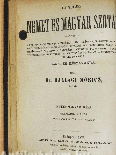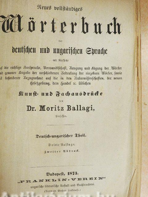 Megjegyzés: Az Új német és magyar szótár harmadik kiadás, második lenyomat, kiadási éve: 1873. A német rész gótbetűs. Irta Dr. Ballagi Móricz tanár. Nyomtatta a Franklin-Társulat nyomdája. Az előzéklapon Ifj. Dr. Entz Géza (1875-1943) biológus tulajdonosi bejegyzésével.