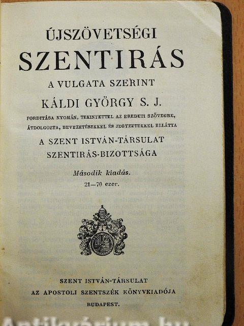 | Megjegyzés: | Második kiadás. Eredeti papír védődobozban. Káldi György S. J. fordítása nyomán, tekintettel az eredeti szövegre, átdolgozta, bevezetésekkel és jegyzetekkel ellátta a Szent István Társulat Szentirás-Bizottsága. Nyomatta a Stephaneum nyomda és könyvkiadó r. t., Budapesten. |