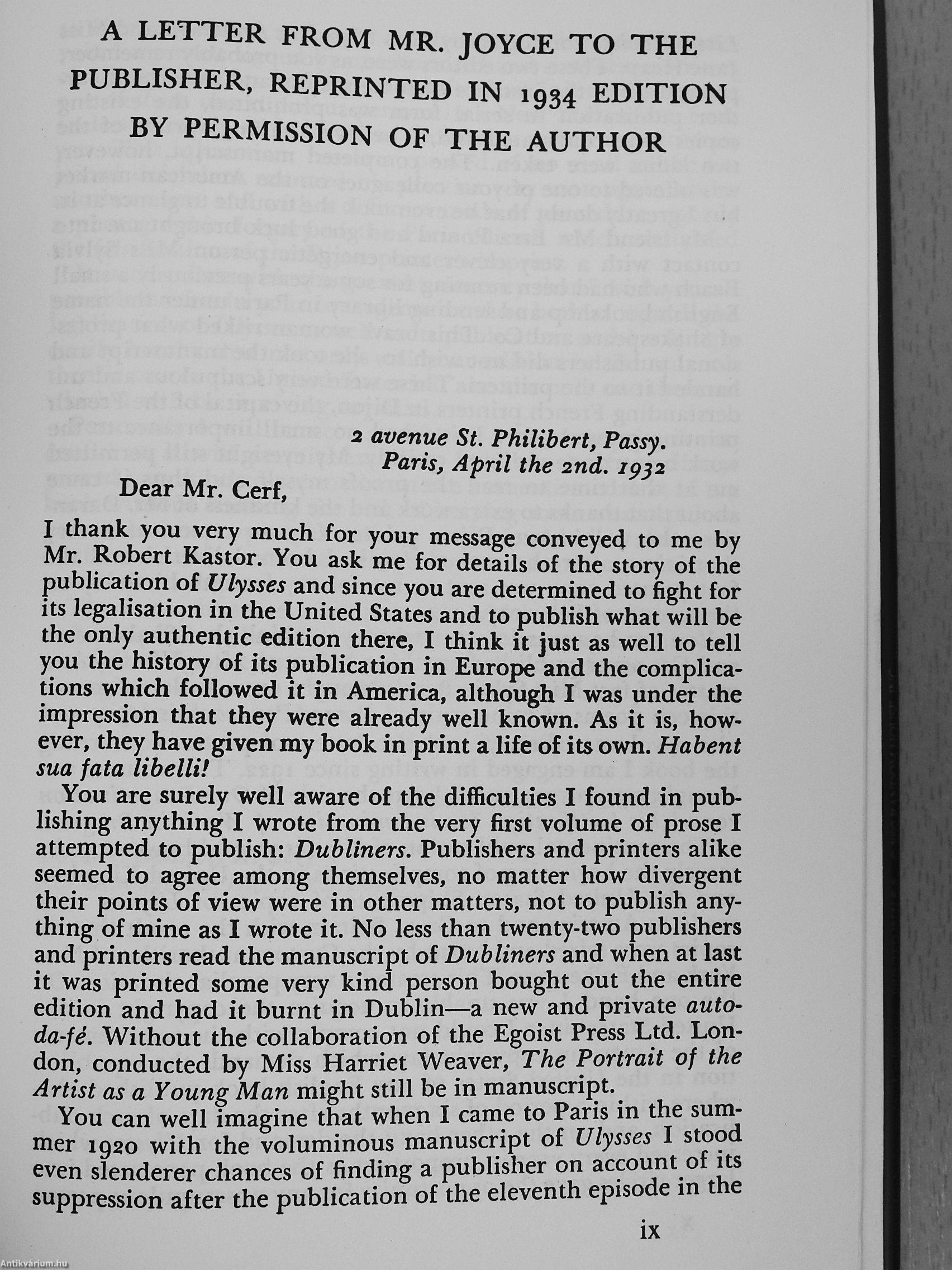 from James Joyce to Bennett Cerf, the publisher of the 1934 text; the decision by Judge John M. Woolsey lifting the ban on Ulysses-, and a Foreword by Morris L. Ernst, who defended the book at the trial.