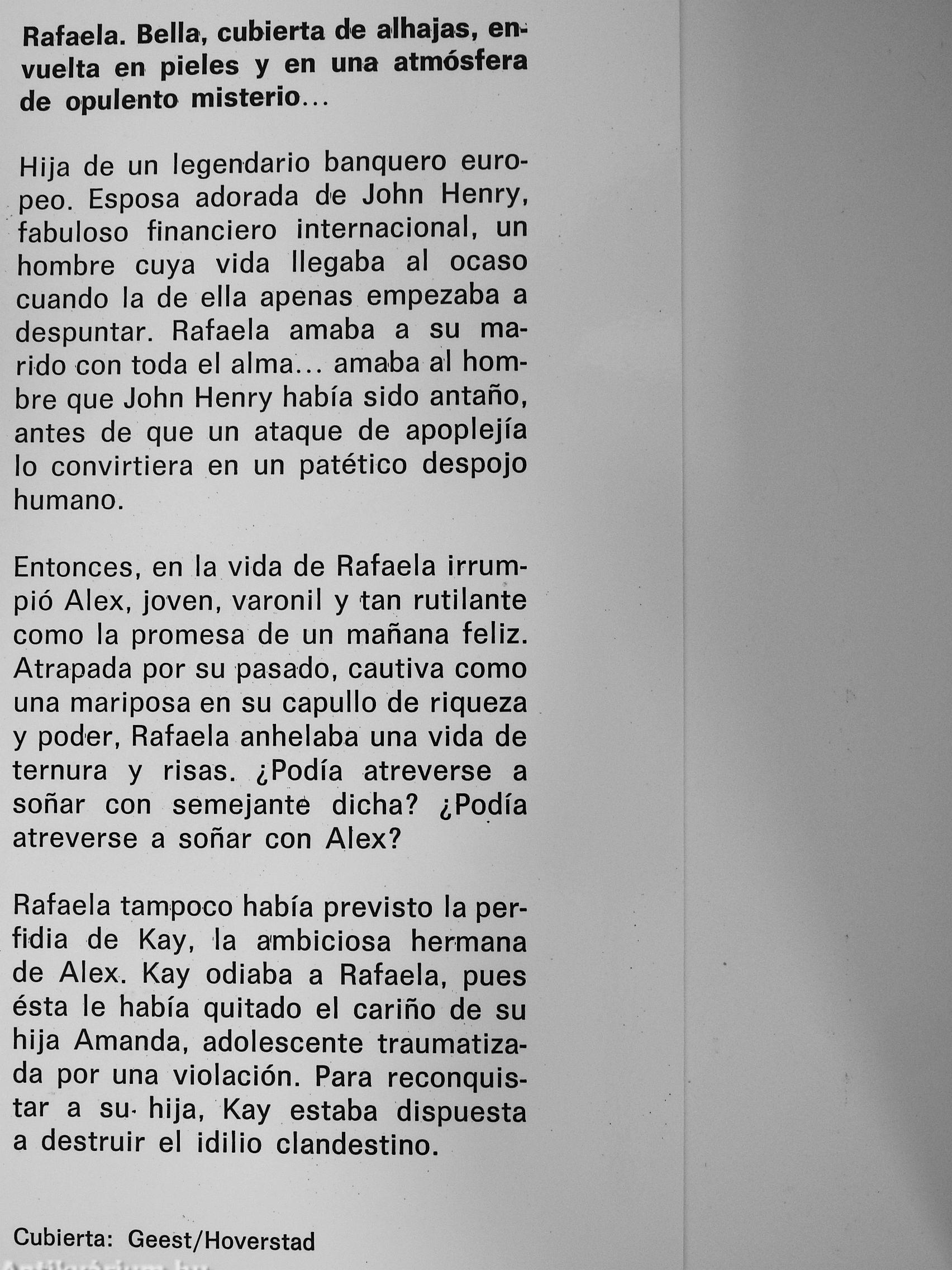 Hija de un legendario banquero europeo. Esposa adorada de John Henry, fabuloso financiero internacional, un hombre cuya vida llegaba al ocaso cuando la de ella apenas empezaba a despuntar. Rafaela amaba a su marido con toda el alma amaba al hombre que John Henry había sido antano, antes de que un ataque de apoplejía lo convirtiera en un patético despojo humano.