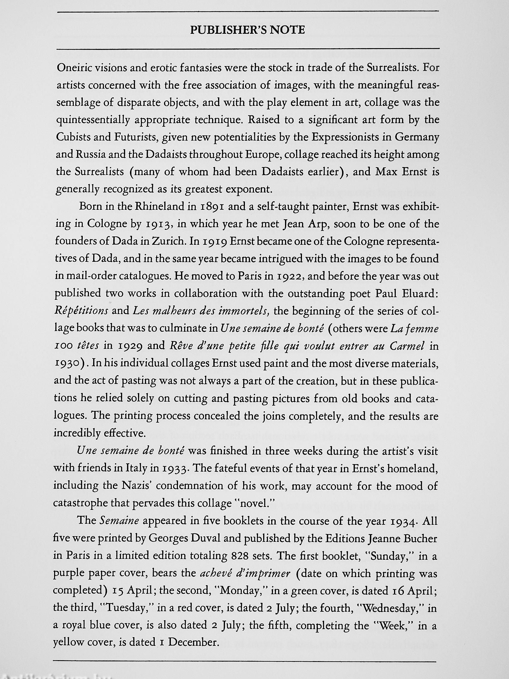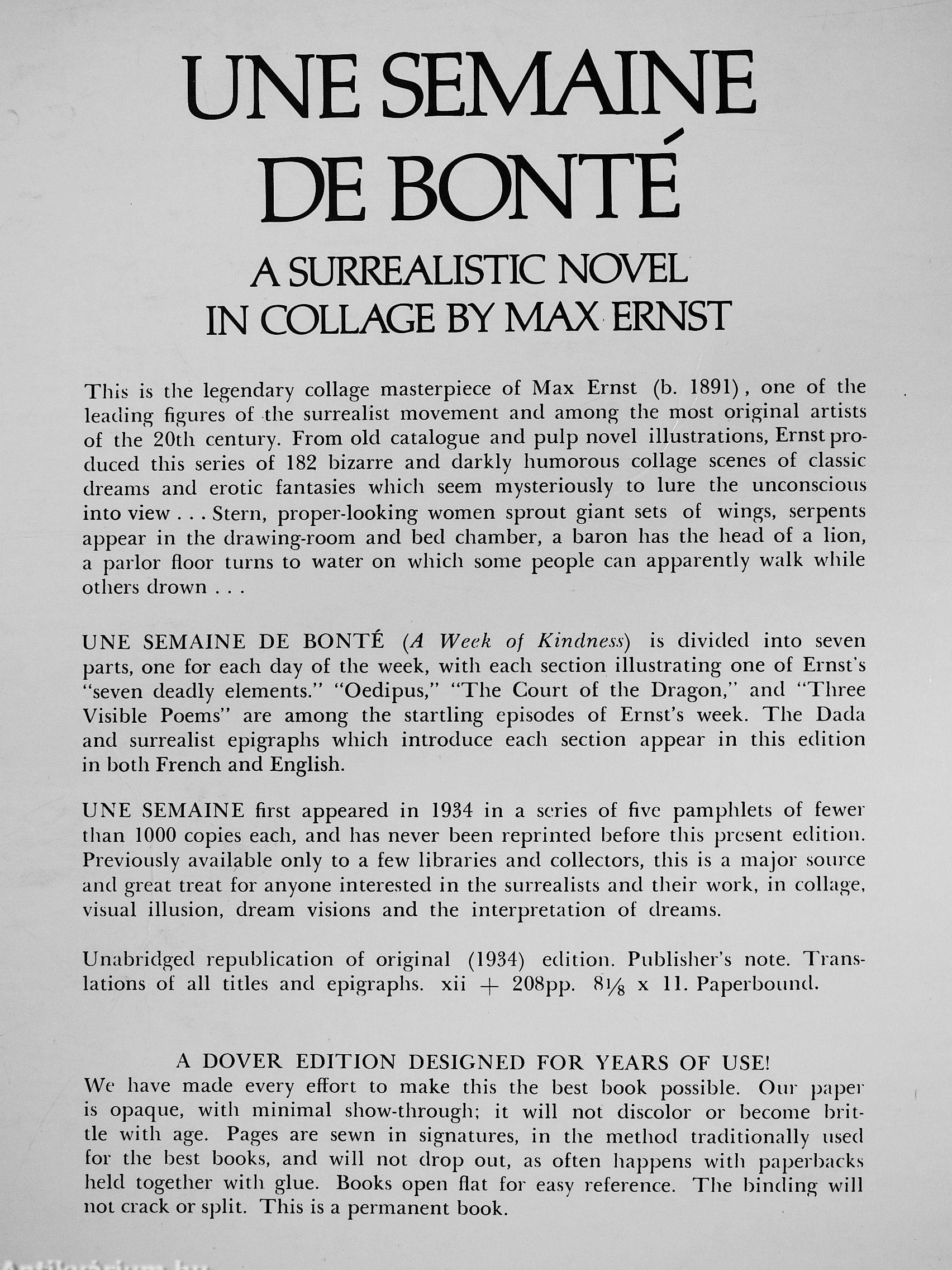 UNE SEMAINE DE BONTÉ (A Week of Kindness) is divided into seven parts, one for each day of the week, with each section illustrating one of Ernst's "seven deadly elements." "Oedipus," "The Court of the Dragon," and "Three Visible Poems" are among the startling episodes of Ernst's week. The Dada and surrealist epigraphs which introduce each section appear in this edition in both French and English.