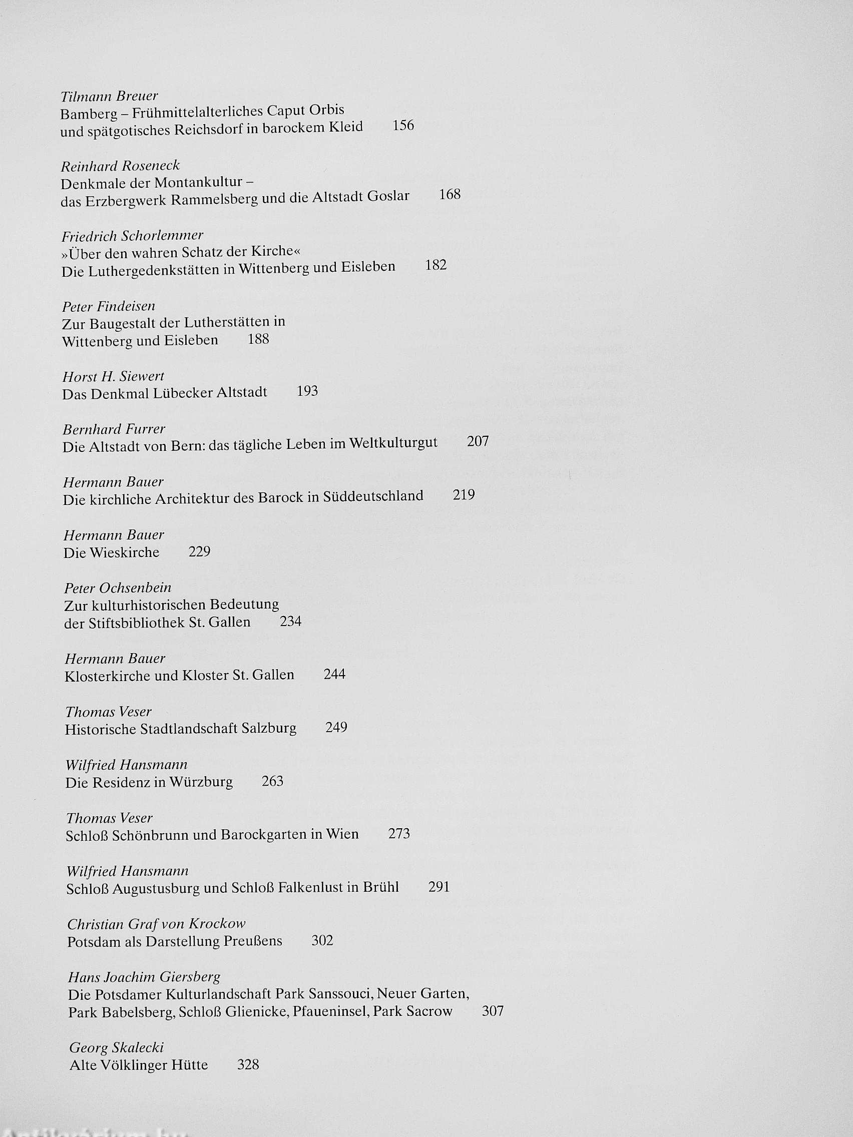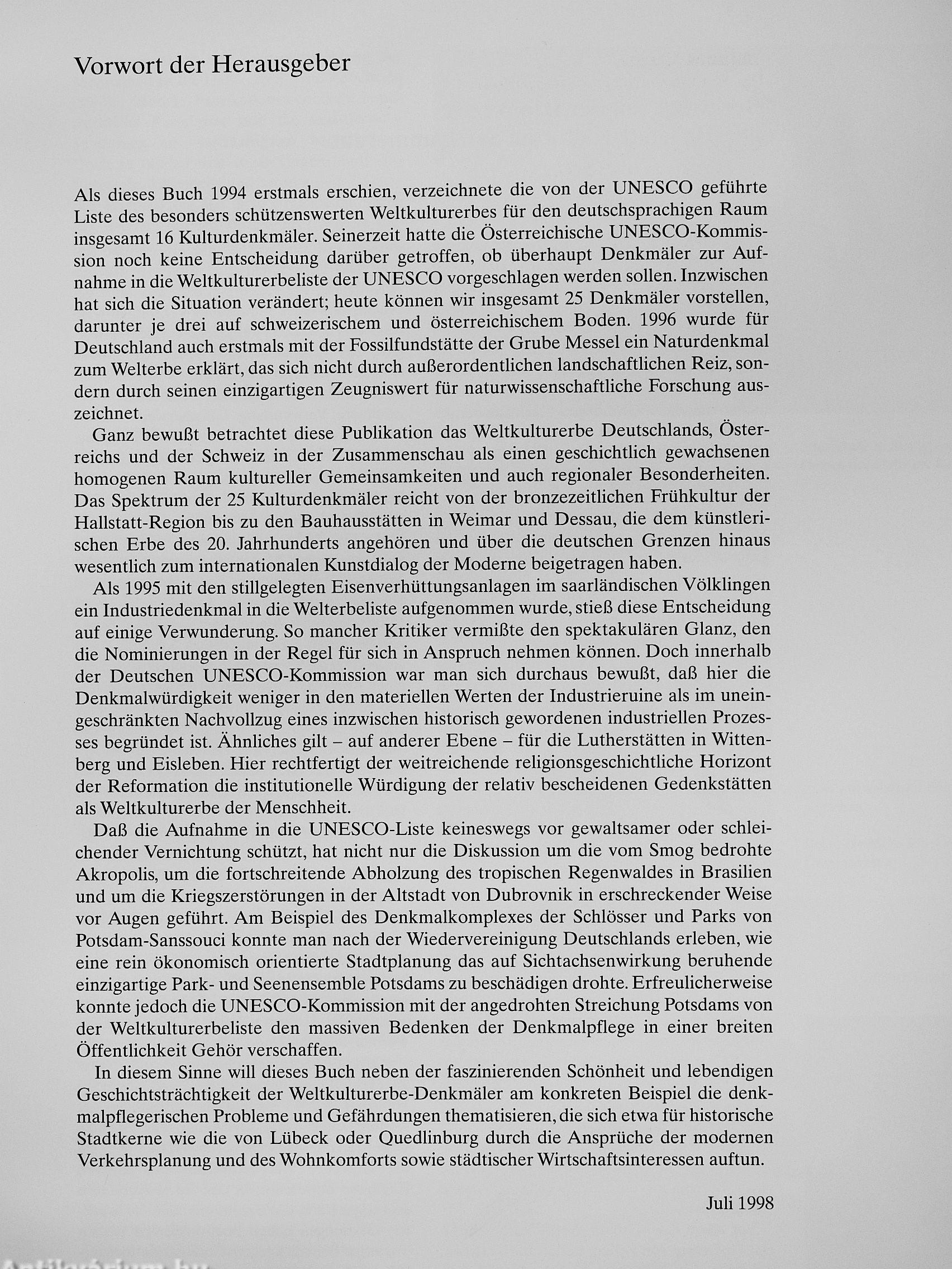 Über 300 farbige Abbildungen zeigen 25 Kulturdenkmäler von einzigartiger Schönheit und faszinierender Geschichts-trächtigkeit, darunter die Schlösser- und Parklandschaft von Potsdam-Sanssouci sowie die historisch gewachsenen Altstädte von Salzburg, Bern oder Quedlinburg.