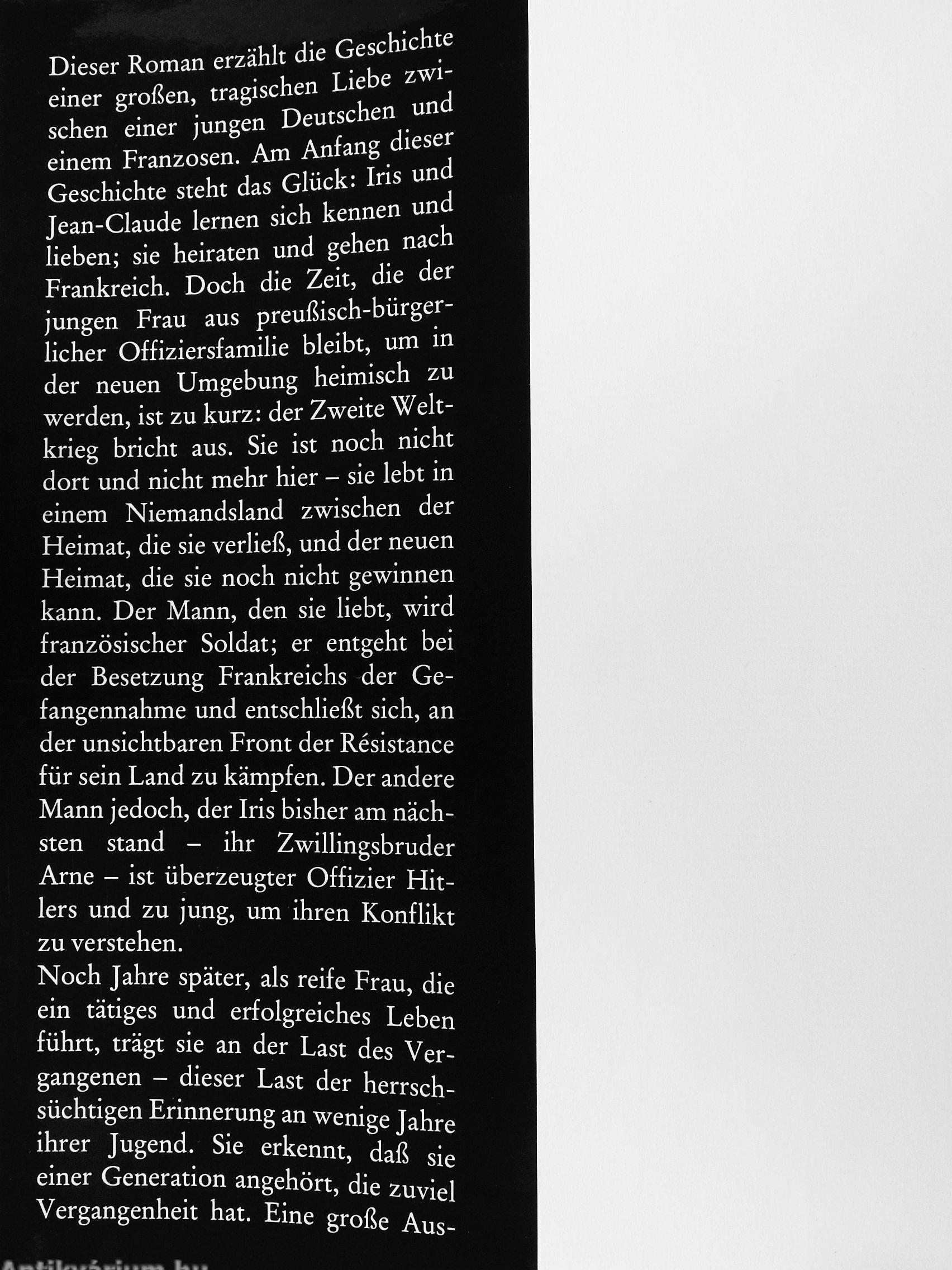 Dieser Roman erzählt die GescW^ einer großen, tragischen Lieoe sehen einer jungen D-t^en ^ einem Franzosen. Am Anfang dieser Geschichte steht das Glück: Ins und Jean-Claude lernen sich kennen una Heben; sie heiraten und gehen nacii Frankreich. Doch die Zeit, die der jungen Frau aus preußisch-burger-licher Offiziersfamilie bleibt, um m der neuen Umgebung heimisch zu werden, ist zu kurz: der Zweite Weltkrieg bricht aus. Sie ist noch nicht dort und nicht mehr hier - sie lebt in einem Niemandsland zwischen der Heimat, die sie verheß, und der neuen Heimat, die sie noch nicht gewinnen kann. Der Mann, den sie Hebt, wird französischer Soldat; er entgeht bei der Besetzung Frankreichs der Gefangennahme und entschHeßt sich, an der unsichtbaren Front der Résistance für sein Land zu kämpfen. Der andere Mann jedoch, der Iris bisher am nächsten stand - ihr ZwilHngsbruder Arne - ist überzeugter Offizier Hitlers und zu jung, um ihren Konflikt zu verstehen.