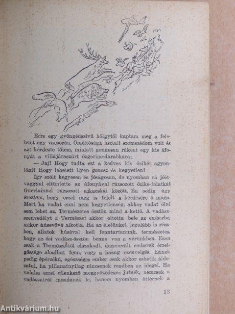 Aztán mégis megtörtént velem, hogy vagy öt évig nem vadásztam. Sokáig magam is azt hittem, hogy azért, mert a kommün alatt elvitték a puskáimat. Ez azonban nem egészen így volt. Mert hiszen szerezhettem volna más puskát, mikor a rend helyreállt, ha komolyan akartam volna. De ez az éppen, hogy nem akartam! Mégpedig azér nem, mert mikor a puskáimat elvitték, már tulajdonképpen nem is igen bántam, hogy nem vadászhatom. Vissza