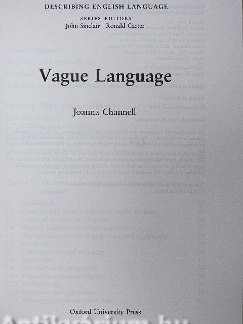 | Joanna Channell az angol nyelv azon tulajdonságát mutatja be, amely hozzájárul a homályos, ködös megfogalmazások, nyelvhasználat előállításához. |