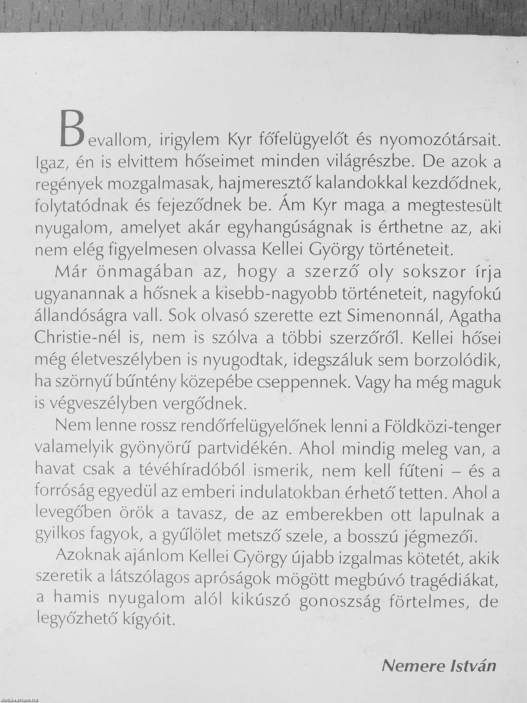 evallom, irigylem Kyr főfelügyelőt és nyomozótársait. Igaz, én is elvittem hőseimet minden világrészbe. De azok a regények mozgalmasak, hajmeresztő kalandokkal kezdődnek, folytatódnak és fejeződnek be. Ám Kyr maga a megtestesült nyugalom, amelyet akár egyhangúságnak is érthetne az, aki nem elég figyelmesen olvassa Kellei György történeteit.