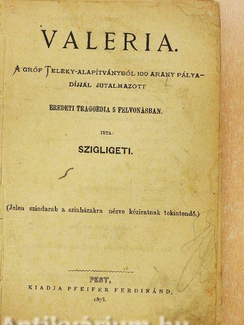 Megjegyzés: Két mű egy kötetben. Kézirat gyanánt. A Valeria című mű 1873-ban lett kiadva. A második művet nyomtatta Löblovits Zs., Budapest.
