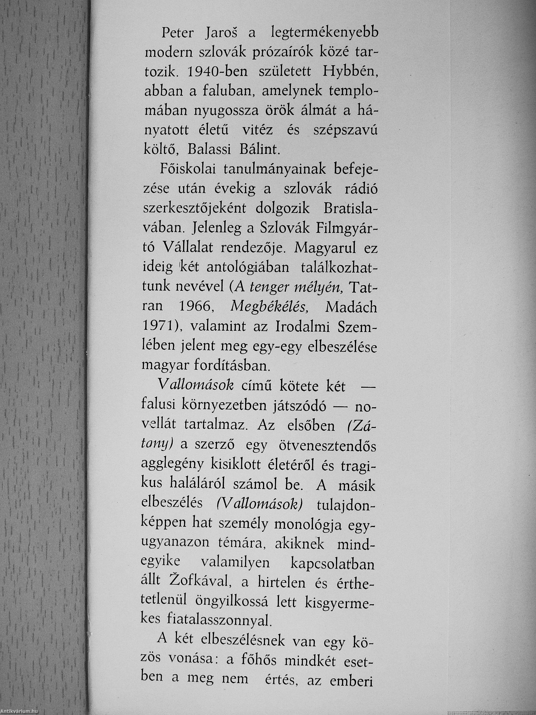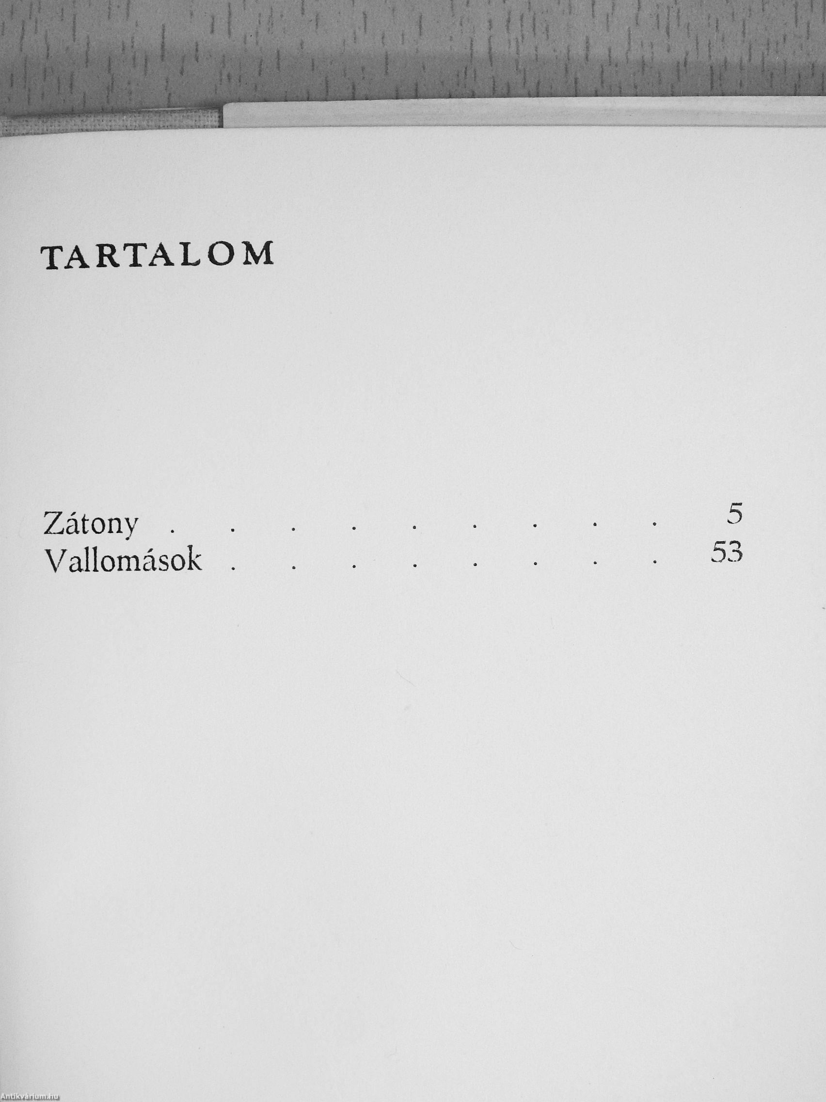 Vallomások cimű kötete két — falusi környezetben játszódó — novellát tartalmaz. Az elsőben (Zátony) a szerző egy ötvenesztendős agglegény kisiklott életéről és tragikus haláláról számol be. A másik elbeszélés (Vallomások) tulajdonképpen hat... Tovább