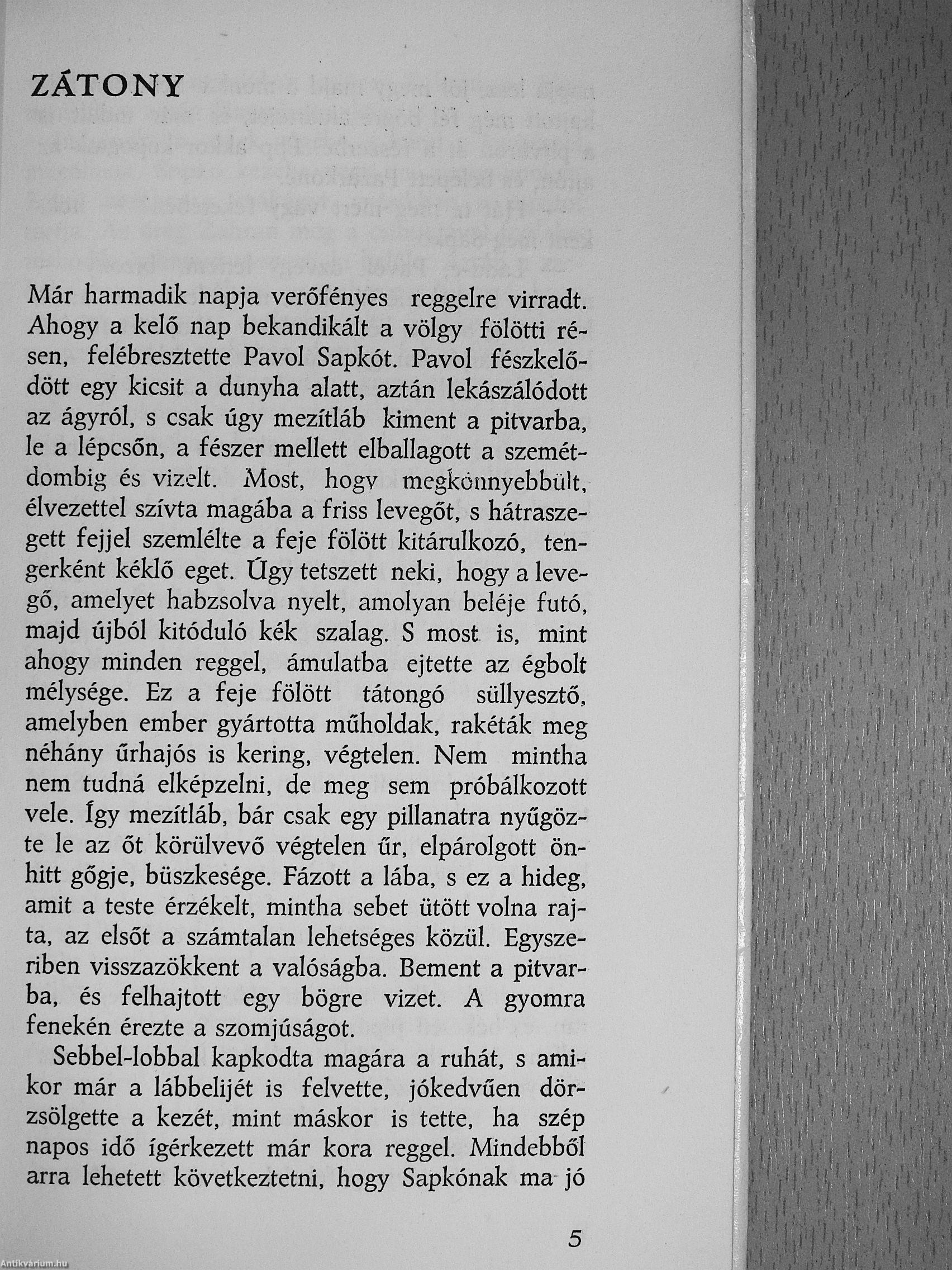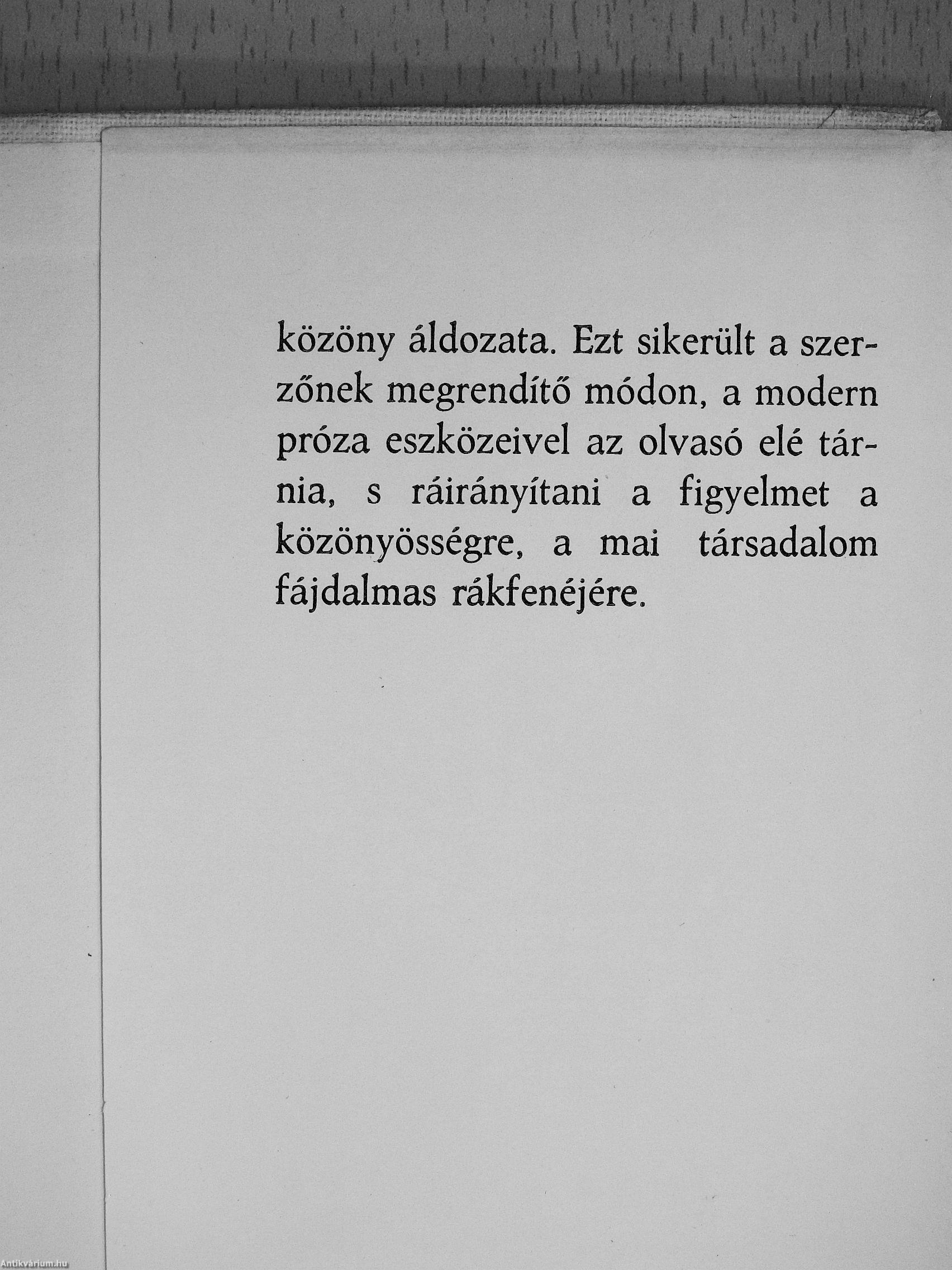 közöny áldozata. Ezt sikerült a szerzőnek megrendítő módon, a modern próza eszközeivel az olvasó elé tárnia, s ráirányítani a figyelmet a közönyösségre, a mai társadalom fájdalmas rákfenéjére. Vissza