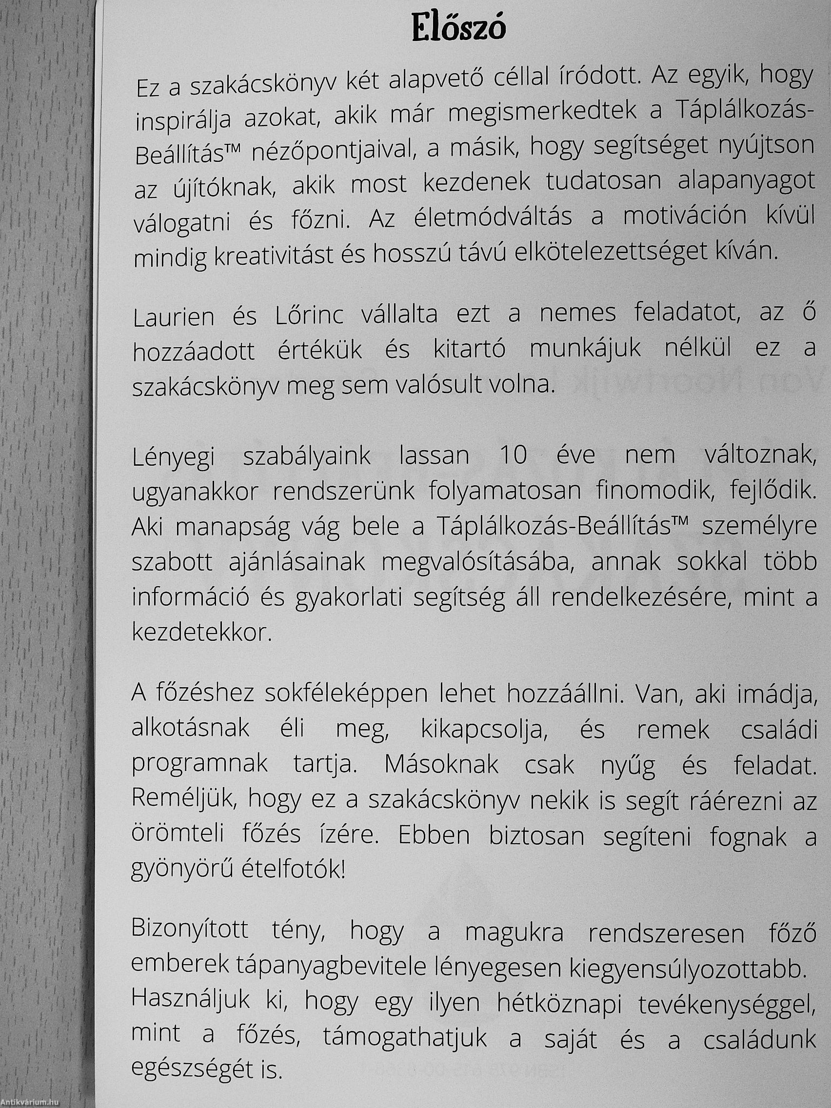"Ez a szakácskönyv két alapvető céllal íródott. Az egyik, hogy inspirálja azokat, akik már megismerkedtek a Táplálkozás-Beállítás™ nézőpontjaival, a másik, hogy segítséget nyújtson az újítóknak, akik most kezdenek tudatosan alapanyagot válogatni és főzni. Az életmódváltás a motiváción kívül mindig kreativitást és hosszú távú elkötelezettséget kíván."