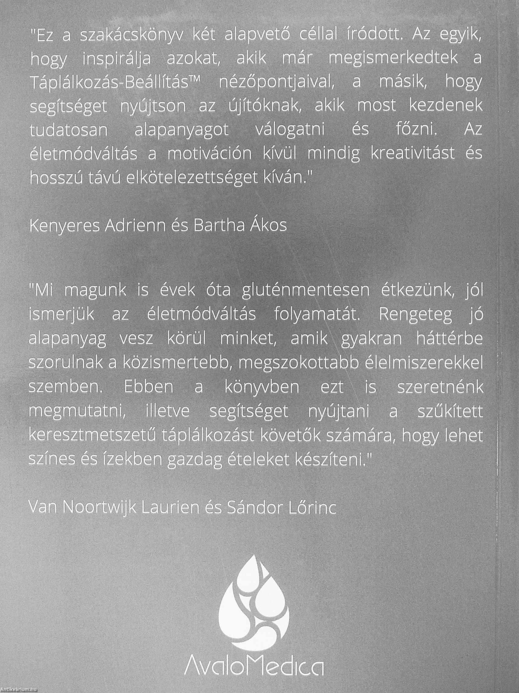 "Mi magunk is évek óta gluténmentesen étkezünk, jól Ismerjük az életmódváltás folyamatát. Rengeteg jó alapanyag vesz körül minket, amik gyakran háttérbe szorulnak a közismertebb, megszokottabb élelmiszerekkel szemben. Ebben a könyvben ezt is szeretnénk megmutatni, illetve segítséget nyújtani a szűkített keresztmetszetű táplálkozást követők számára, hogy lehet színes és ízekben gazdag ételeket készíteni."