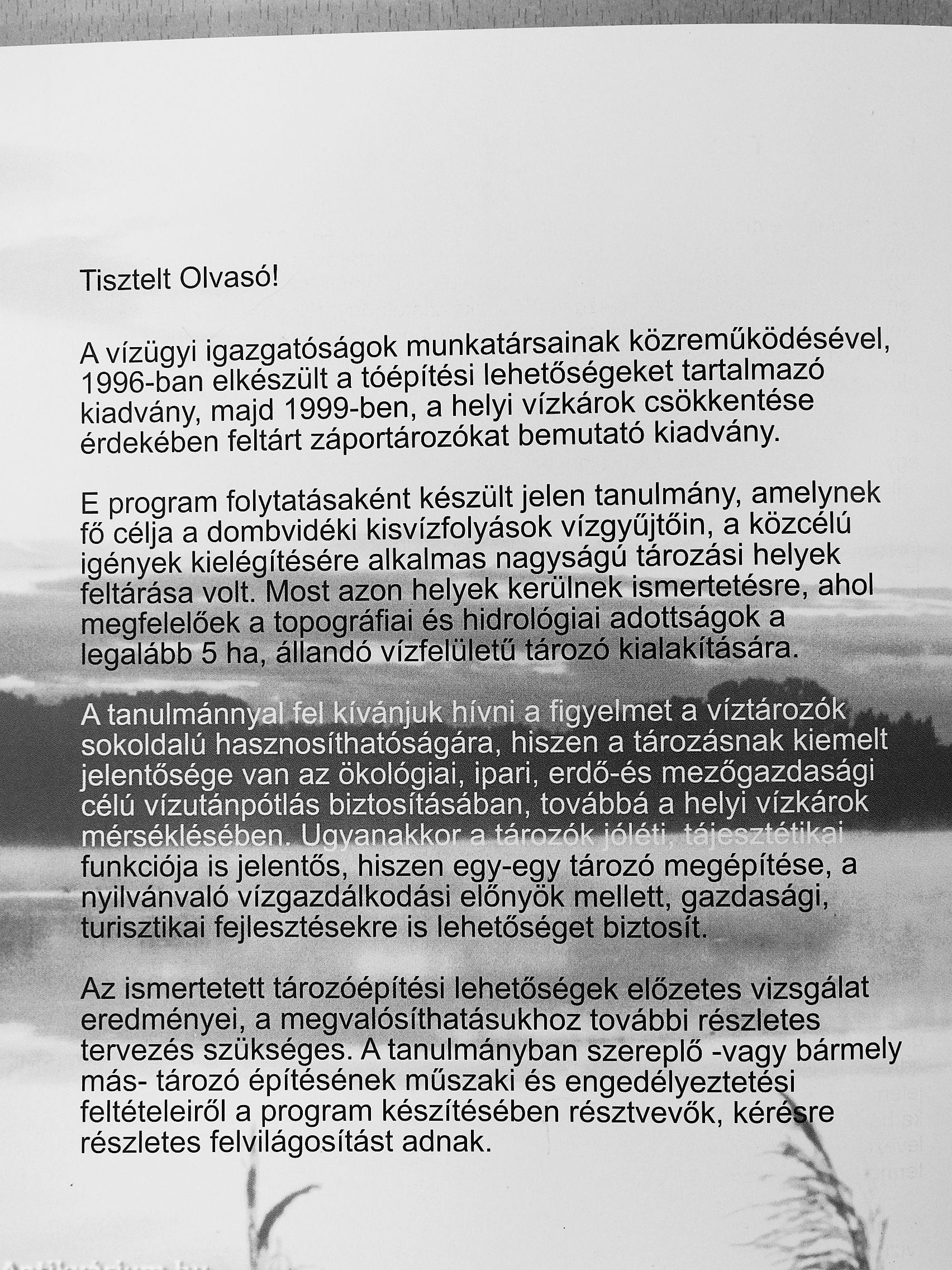 E program folytatásaként készült jelen tanulmány, amelynek fő célja a dombvidéki kisvízfolyások vízgyűjtőin, a közcélú igények kielégítésére alkalmas nagyságú tározási helyek feltárása volt. Most azon helyek kerülnek ismertetésre, ahol megfelelőek a topográfiai és hidrológiai adottságok a legalább 5 ha, állandó vízfelületű tározó kialakítására.