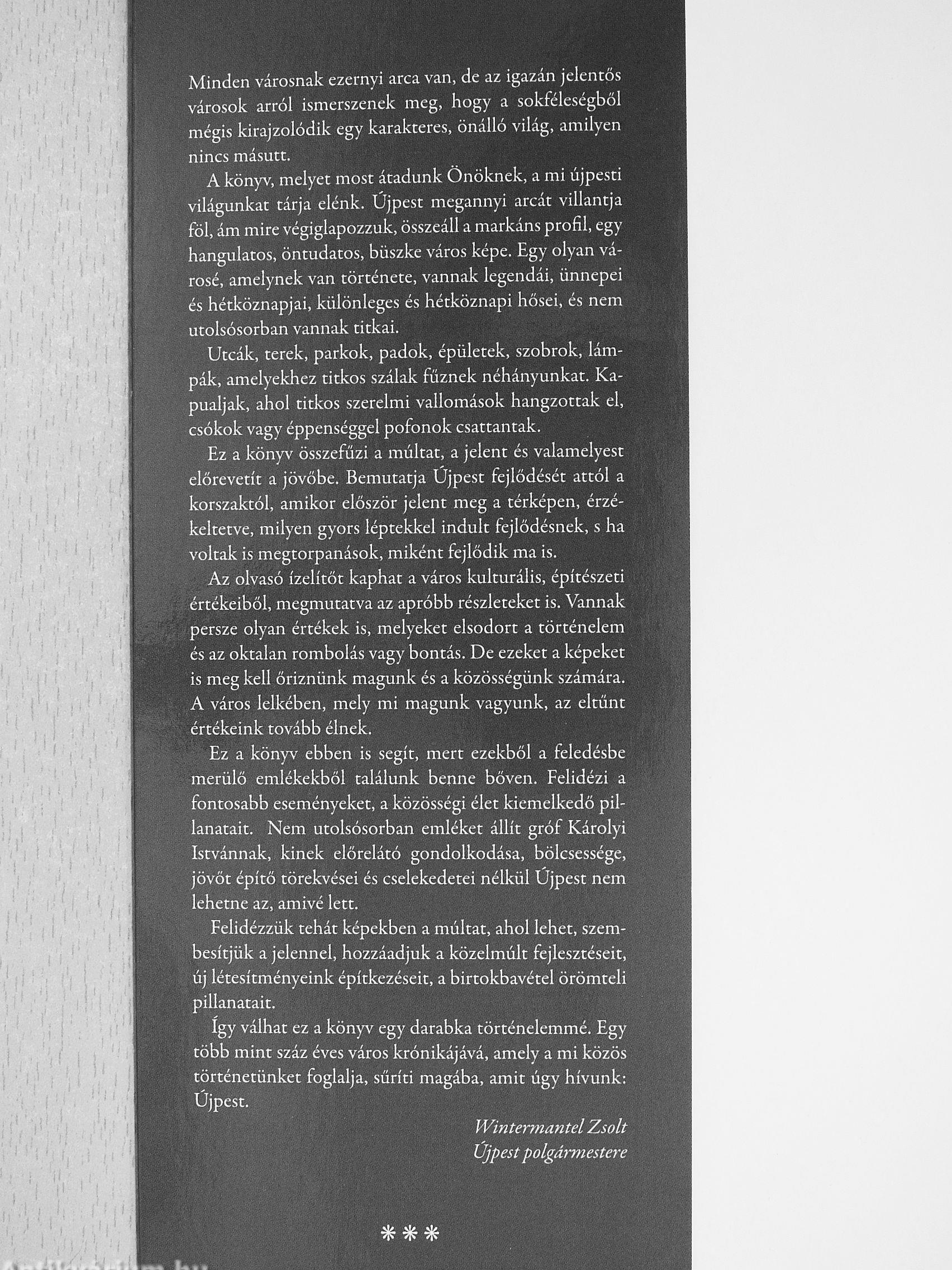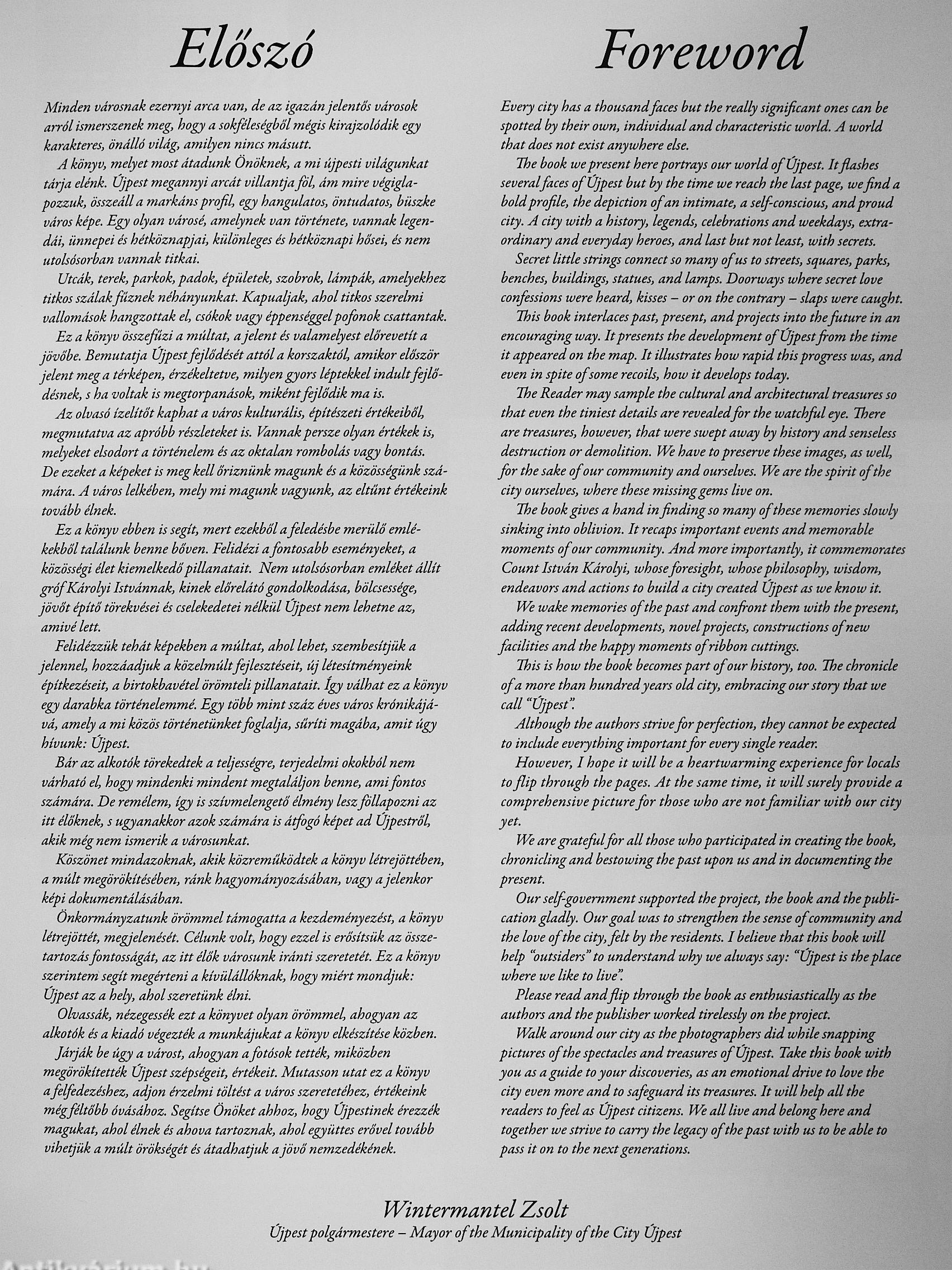 A könyv, melyet most átadunk Önöknek, a mi újpesti világunkat tárja elénk. Újpest megannyi arcát villantja föl, ám mire végiglapozzuk, összeáll a markáns profil, egy hangulatos, öntudatos, büszke város képe. Egy olyan városé, amelynek van története, vannak legendái, ünnepei és hétköznapjai, különleges és hétköznapi hősei, és nem utolsósorban vannak titkai.