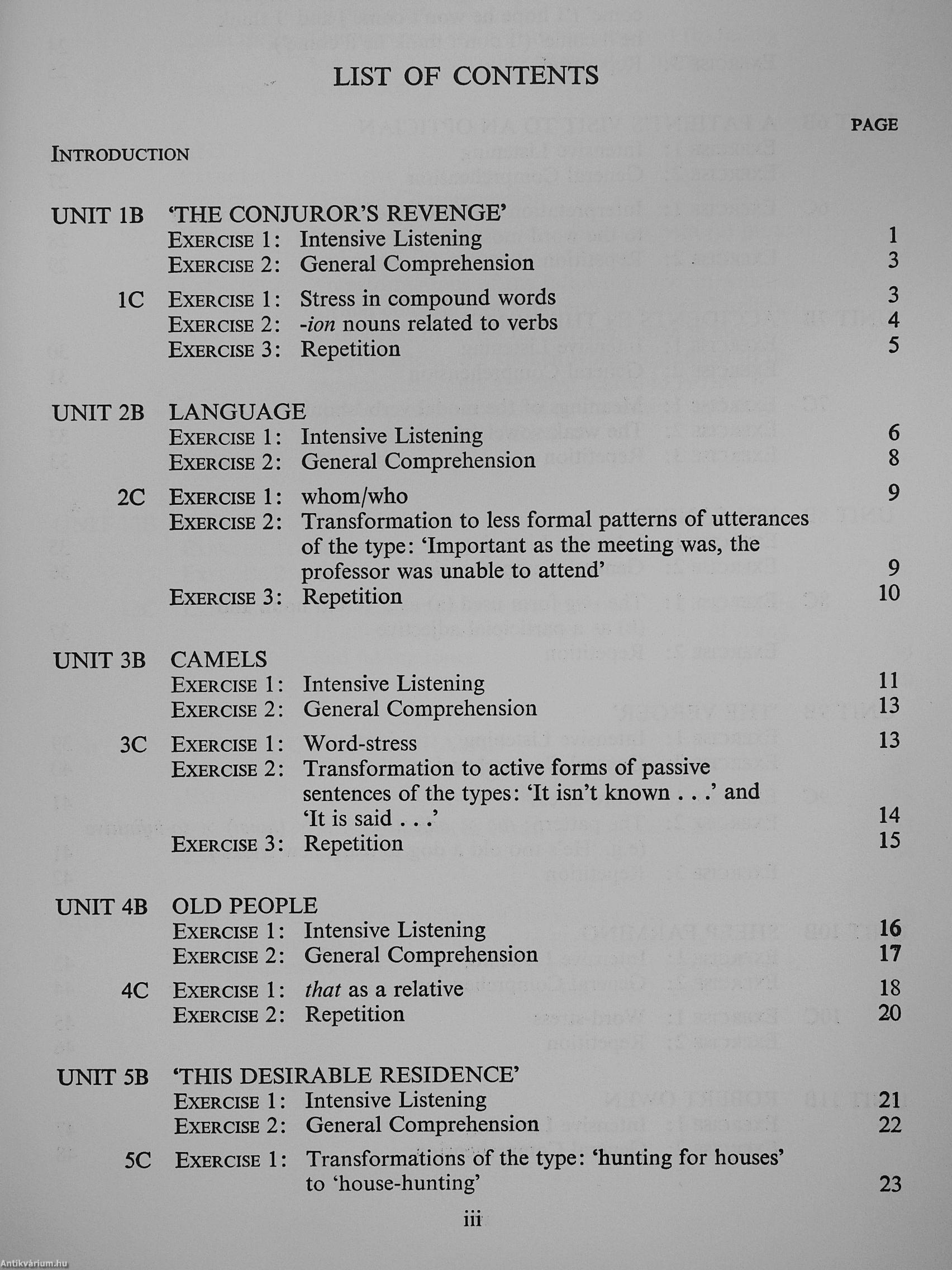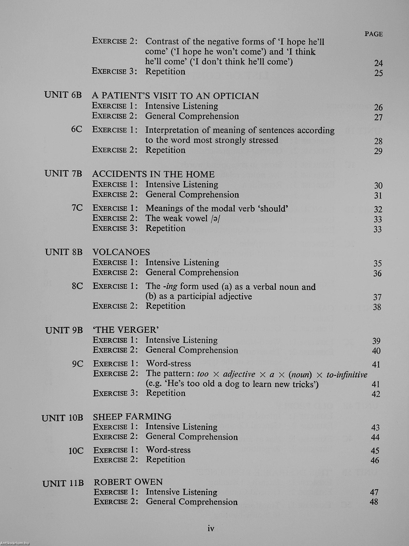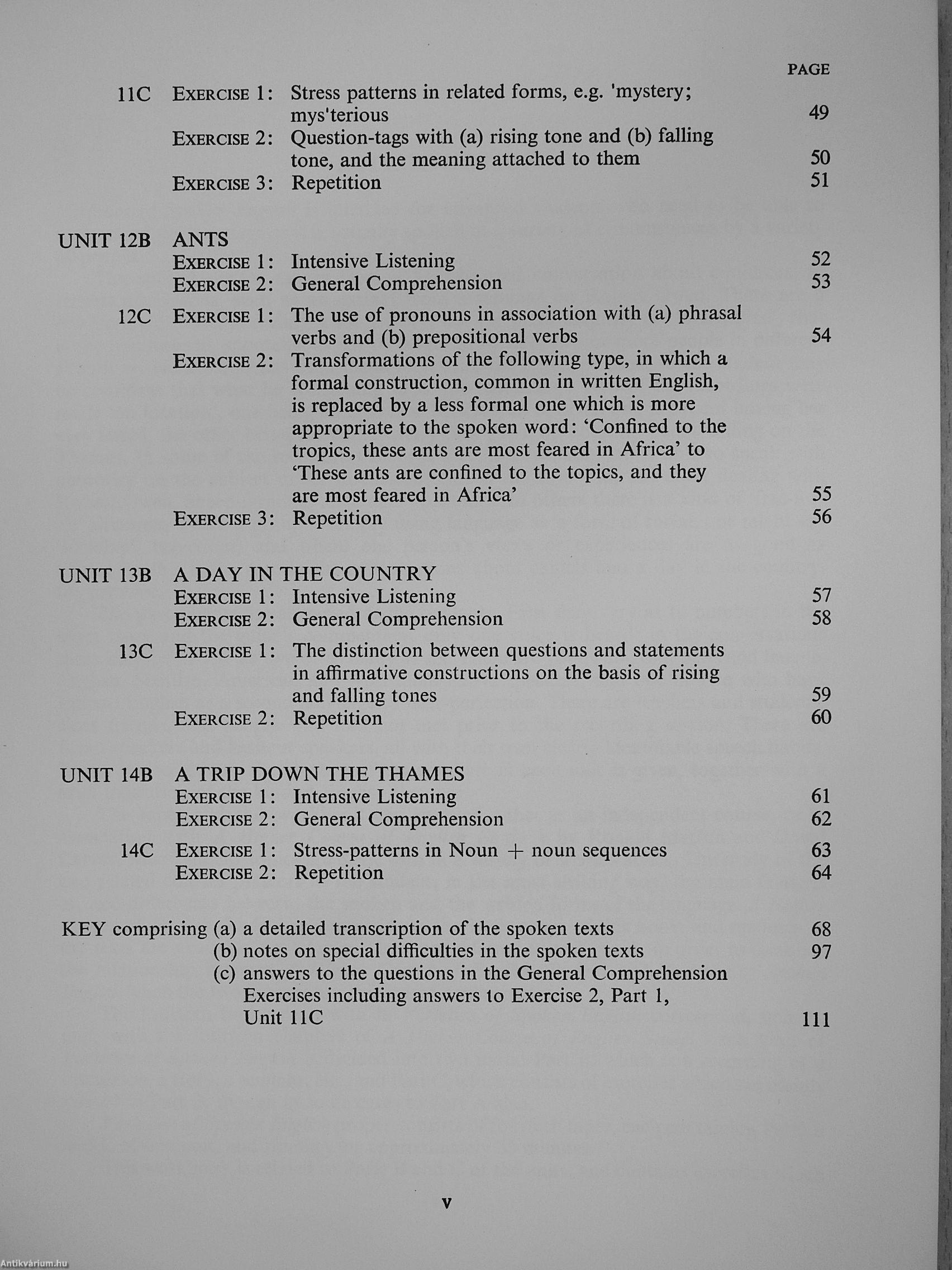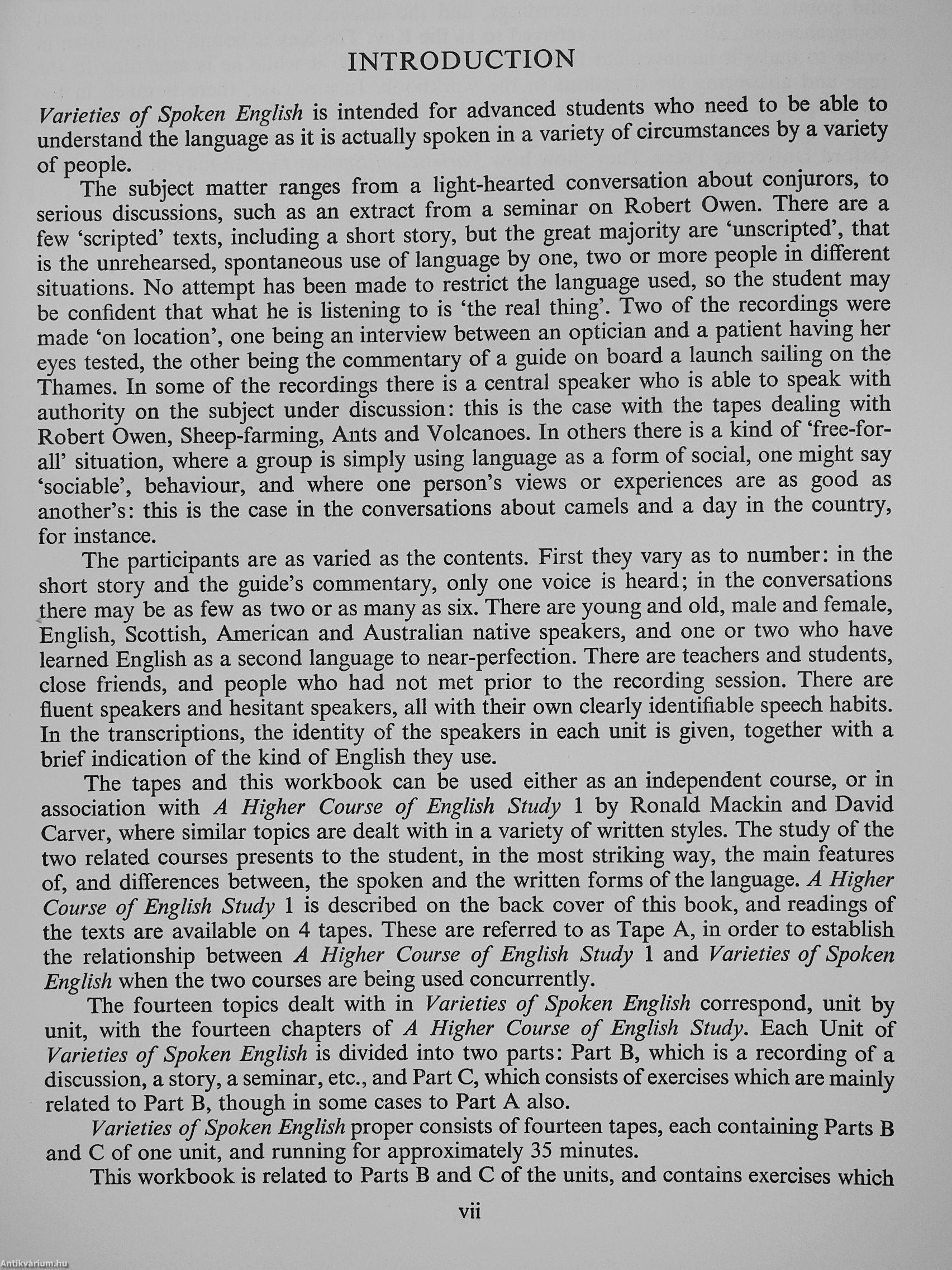 The course comprises this workbook and fourteen tapes. The kernel of each of the fourteen units is an unscripted recording of a specific type of natural spoken English, using a wide variety of voices. Exercises using the workbook and tapes provide guided comprehension practice with the recordings, at intensive and extensive levels, and practice in features of stress, intonation, fluency and the formation of complex utterances.