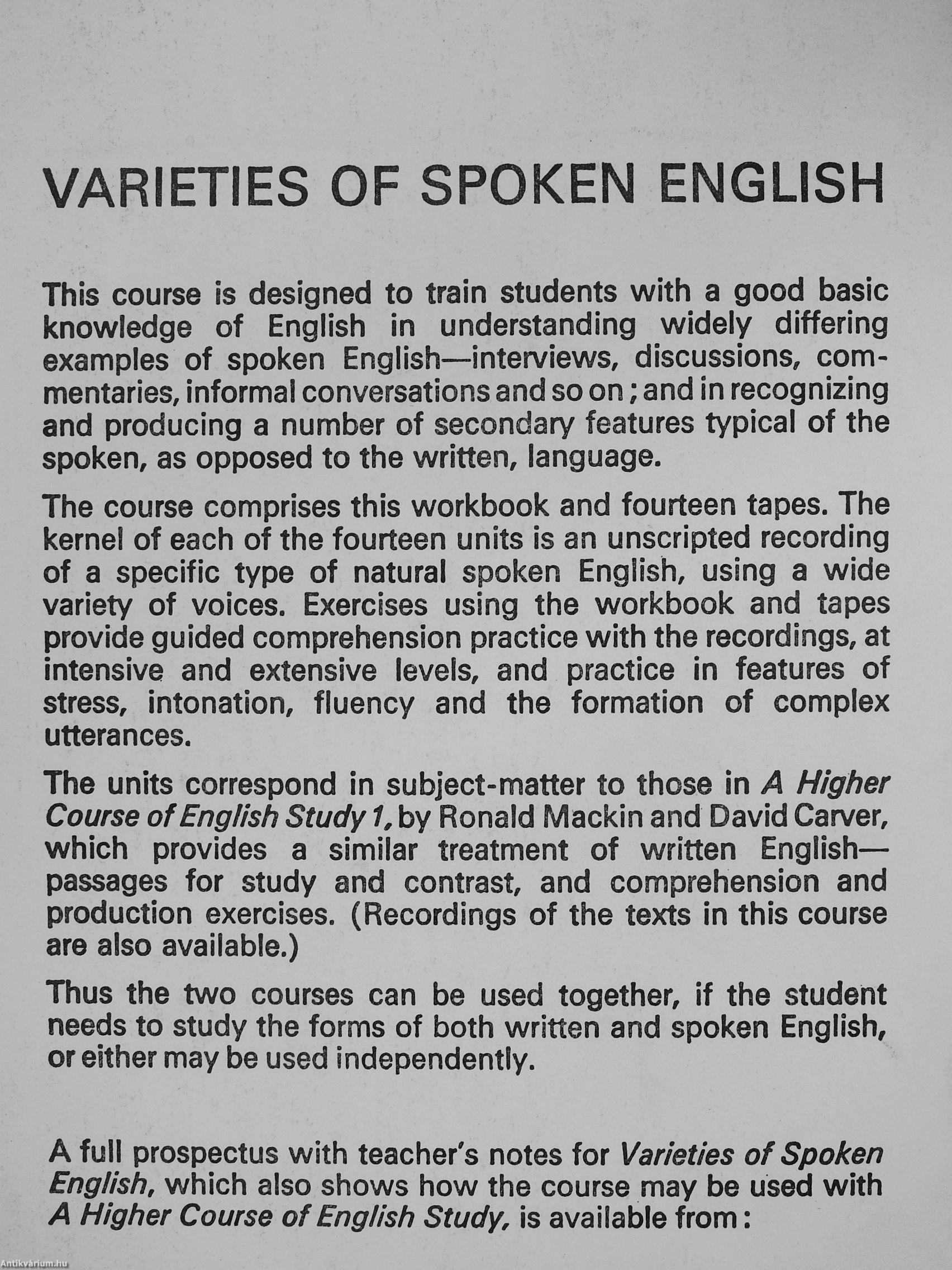 The units correspond in subject-matter to those in A Higher Course of English Study 1, by Ronald Mackin and David Carver, which provides a similar treatment of written English-passages for study and contrast, and comprehension and production exercises. (Recordings of the texts in this course are also available.)