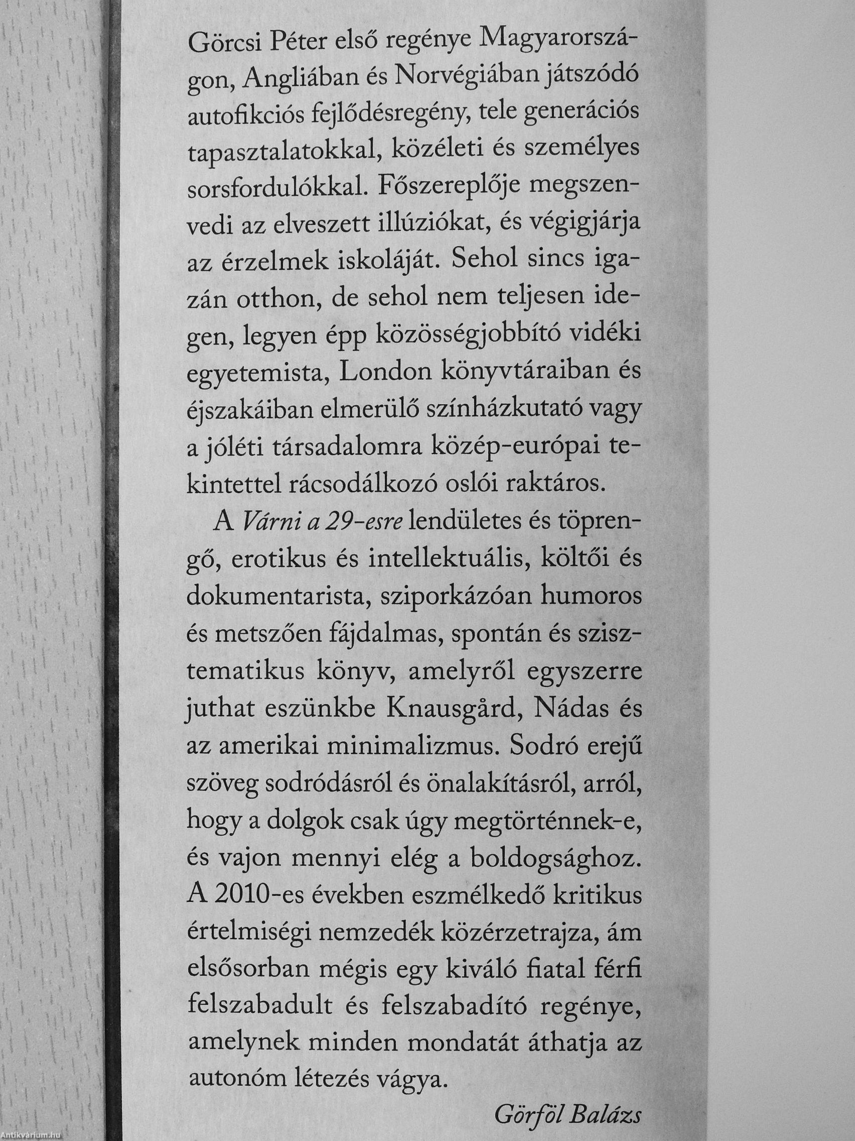 A Várni a 29-esre lendületes és töprengő, erotikus és intellektuális, költői és dokumentarista, sziporkázóan humoros és metszően fájdalmas, spontán és szisztematikus könyv, amelyről egyszerre juthat eszünkbe Knausgárd, Nádas és az amerikai minimaiizmus. Sodró erejű szöveg sodródásról és önalakításról, arról, hogy a dolgok csak úgy megtörténnek-e, és vajon mennyi elég a boldogsághoz. A 2010-es években eszmélkedő kritikus értelmiségi nemzedék közérzetrajza, ám elsősorban mégis egy kiváló fiatal férfi felszabadult és felszabadító regénye, amelynek minden mondatát áthatja az autonóm létezés vágya.