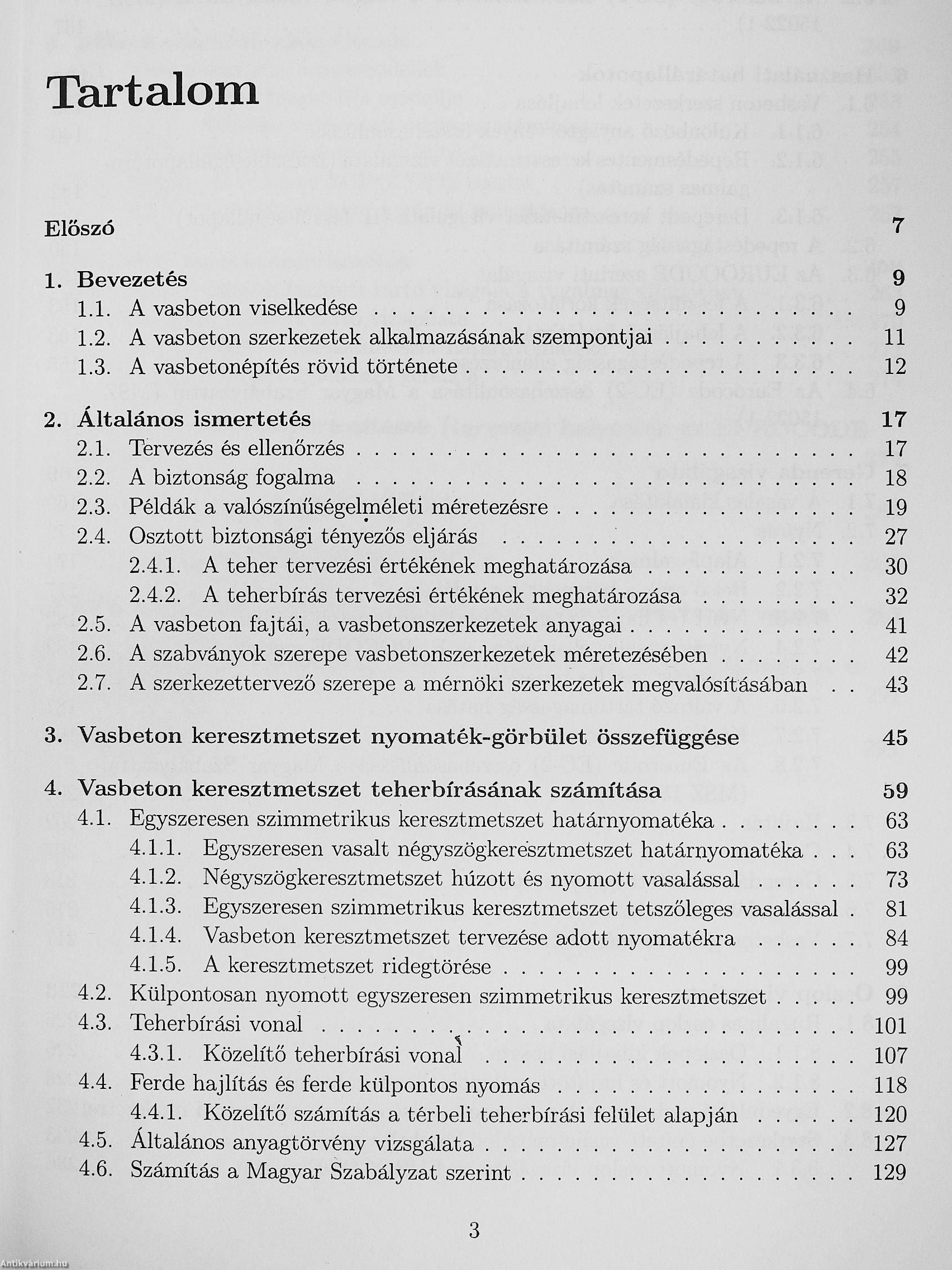 A könyv fő fejezetei: 1. Bevezetés, 2. Általános ismertetés, 3. Vasbeton keresztmetszet nyomaték-görbület összefüggése, 4. Vasbeton keresztmetszet teherbírásának számítása, 5. Határállapotok, 6. Használati határállapotok, 7. Gerenda vizsgálata, 8. Oszlop vizsgálata, 9. Időben elhúzódó alakváltozás, 10. Feszített vasbetonszerkezetek. A könyvben részletes mintapéldák találhatók, összesen mintegy 50.