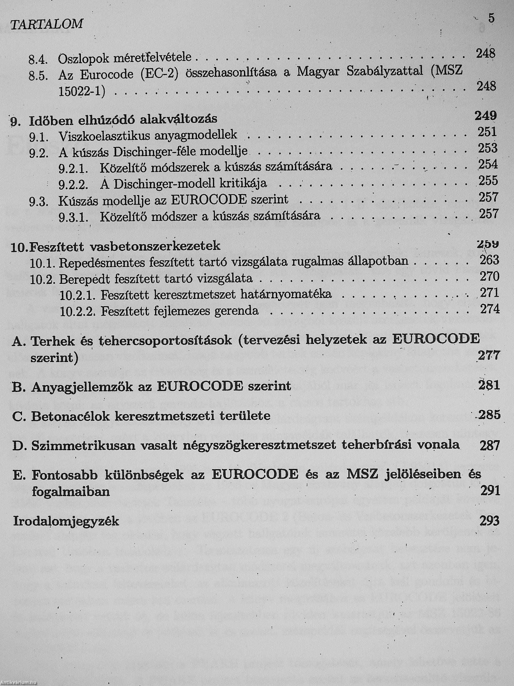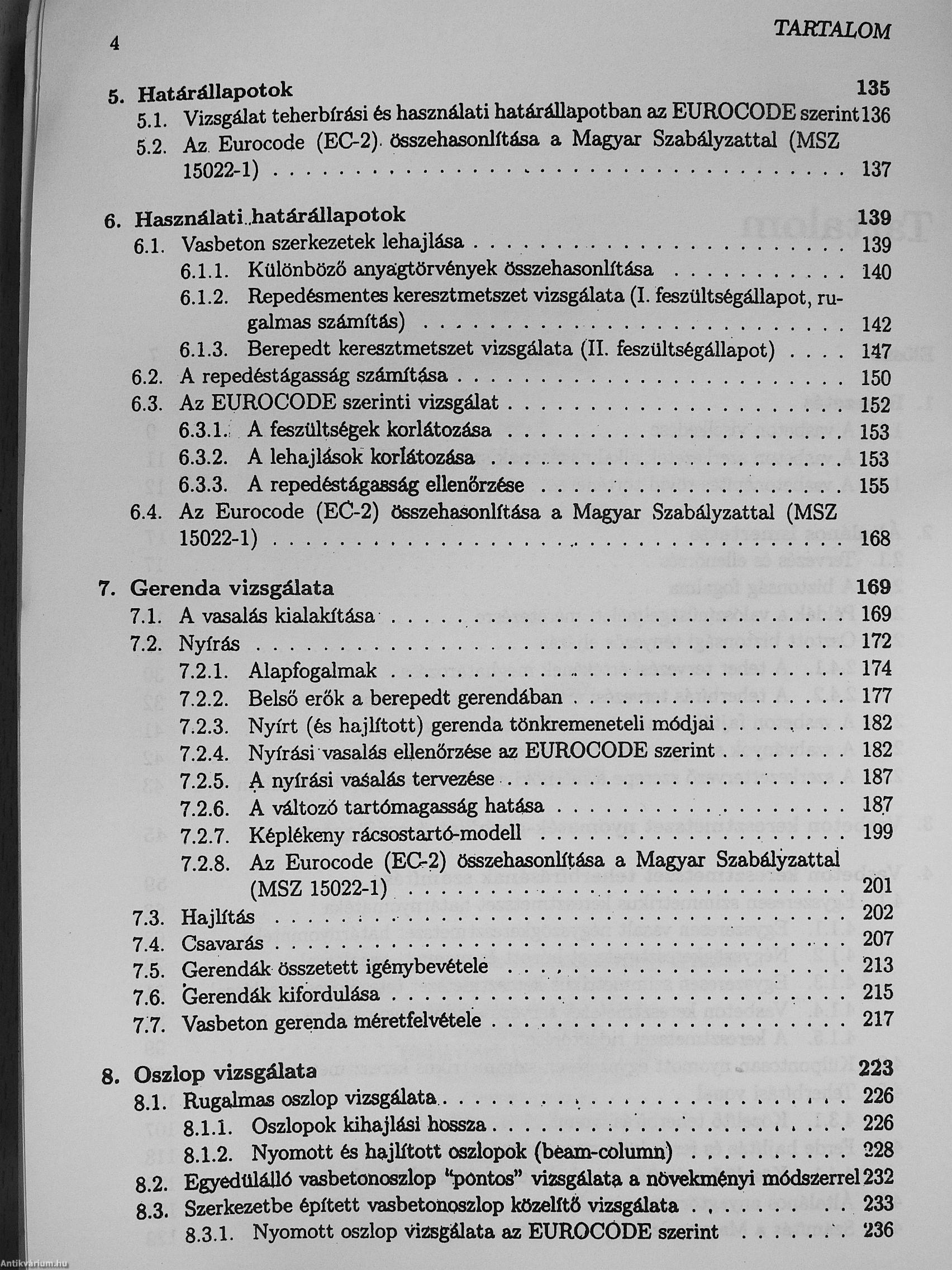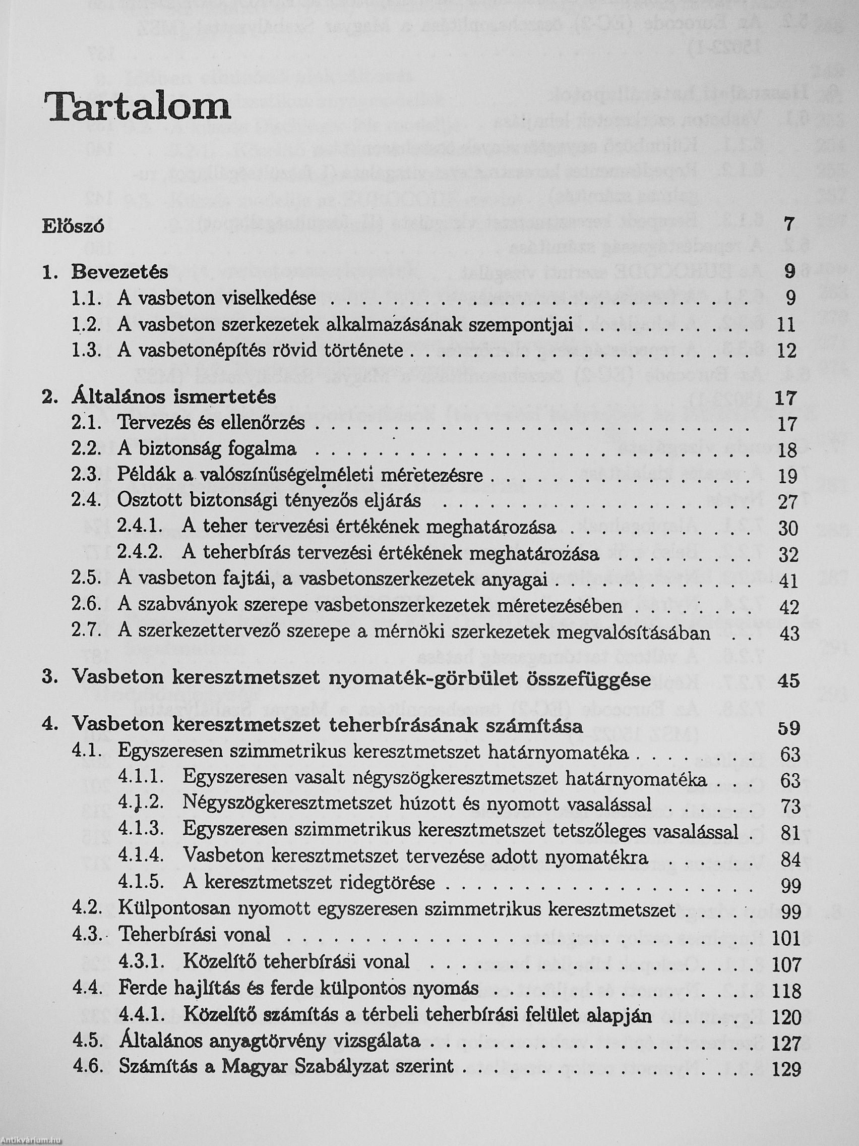A könyv fő fejezetei: 1. Bevezetés, 2. Általános ismertetés, 3. Vasbeton keresztmetszet nyomaték-görbület összefüggése, 4. Vasbeton keresztmetszet teherbírásának számítása, 5. Határállapotok, 6. Használati határállapotok, 7. Gerenda yizsgálata, 8. Oszlop vizsgálata, 9. Időben elhúzódó alakváltozás, 10. FeszítW vasbetonszerkezetek. A könyvben részletes mintapéldák találhatók, összesen mintegy 50.