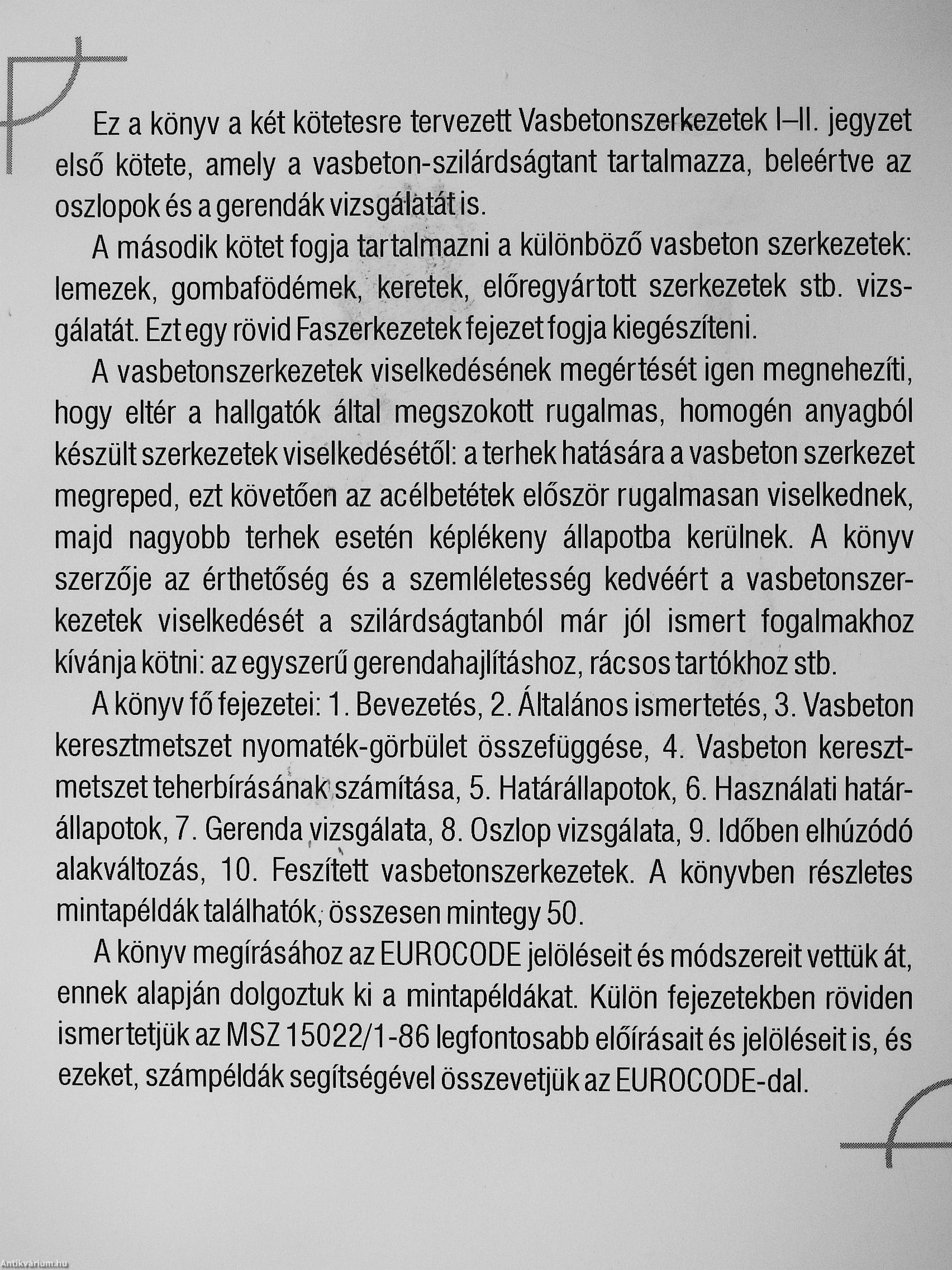 Ez a könyv a két kötetesre tervezett Vasbetonszerkezetek l-ll. jegyzet első kötete, amely a vasbeton-szilárdságtant tartalmazza, beleértve az oszlopok és a gerendák vizsgálatát is.