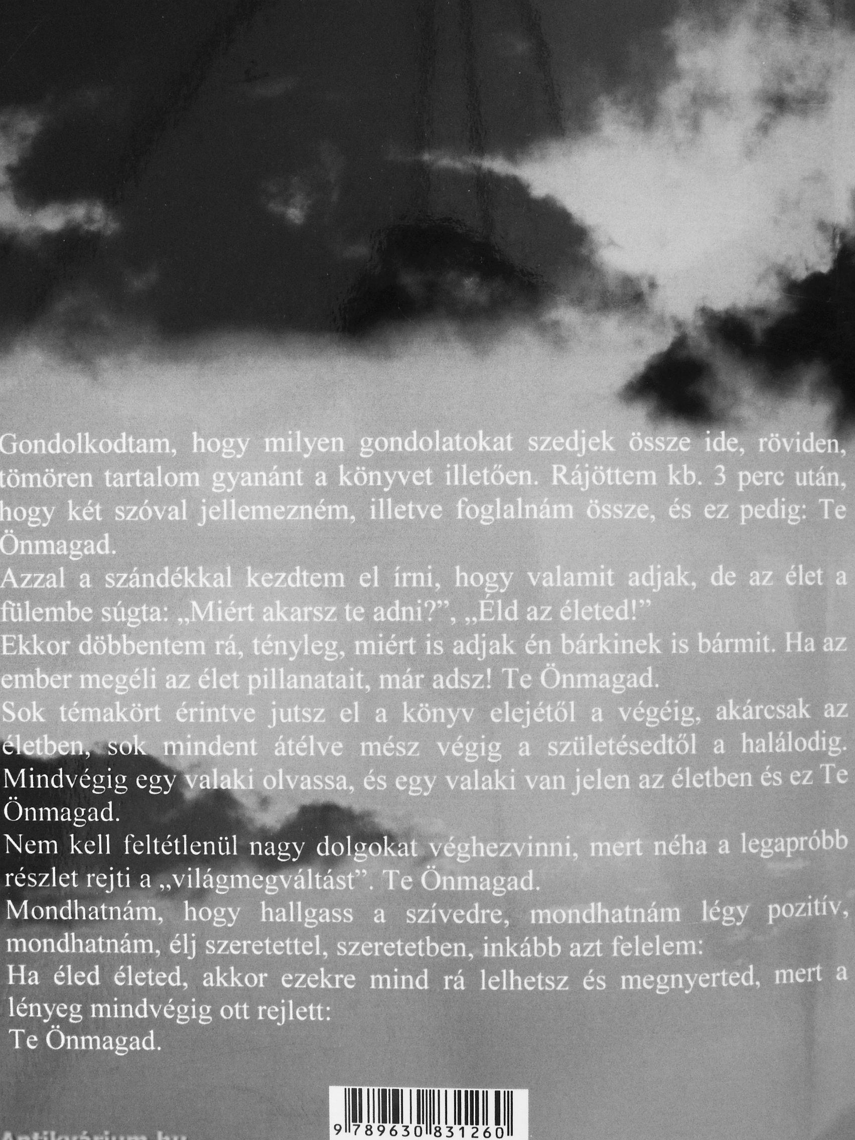 Asal a szándékkal kezdtem el ími, h^-, vmlamit adjak, di az étet ^ fulefnbe súgta: JVíiért akarsz te adni?", ^Id az életed!" Ekkor döbhcraem rá, lcn\ leg, miért is ad^ak én bárkinek is tórmk. Ha az ember n^éli az Set piUanatait, már adsz! Te Önmagad. SQk,jJá!^prt;^mtve jutsz el a könyv ekjétől a végéig, akárcsak az ^^^j^l'^'^Élíiíl^dent étéJve mész végig a szfiletéseAöJ a halálodig. Mindvégig egy yalaki olvassa, és egy valaki van jelen az életben és ez Te Önmagad.