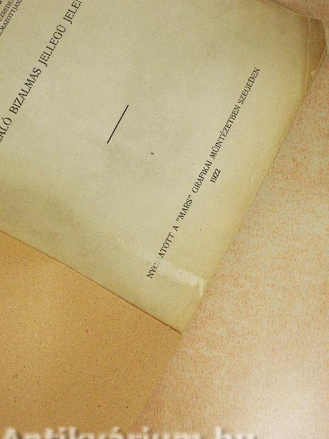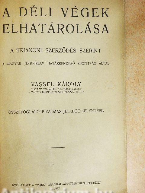 Megjegyzés: A Magyar-jugoszláv Határrendező Bizottság által Vassel Károly M. Kir. vezérkari testületbeli ezredes, a Magyar Kormány meghatalmazottjának összefoglaló bizalmas jellegü jelentése. Nyomtatta a "Mars" Grafikai Műintézetben, Szeged.