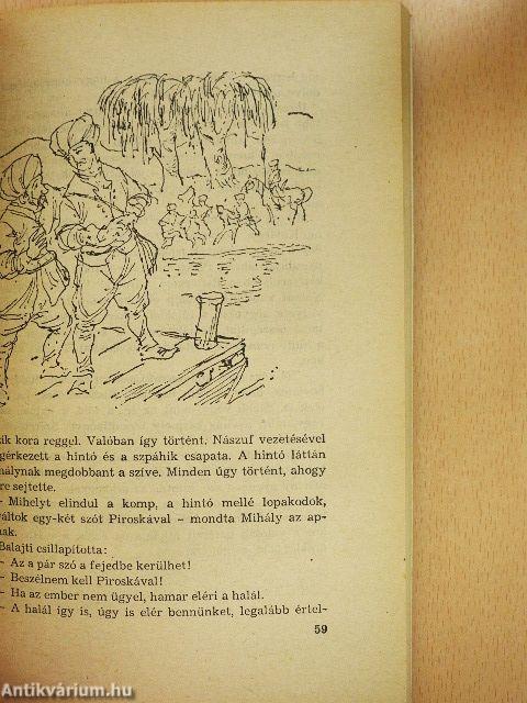Ez a regény félig mese, és csak félig valóság. De hát ez így is jól van, hiszen annyi mindent tudunk már a hajdani török világról, hogy jólesik olyankor kötetlenül elálmodni rajta, és azoknak a régi, nehéz időknek emlékét a képzelet játékával deríteni. Így tett Barabás Tibor is: kis regényében egymást kergetik a kalandok és az izgalmas bonyodalmak, miközben kedves hőseinek, Pethő Miskának, a derék csizmadialegénynek és Balajti Piroskának, a legszebb újvári kislánynak operettbe illő szerelmét szövögeti. Jófajta kis szünidei olvasmány Barabás Tibor regénye. Annyit elárulhatunk, hogy a sok üldözésnek, meglepő fordulatnak boldog vége lesz. No de addig! Pethő Miskának hét próbát kell kiállnia...