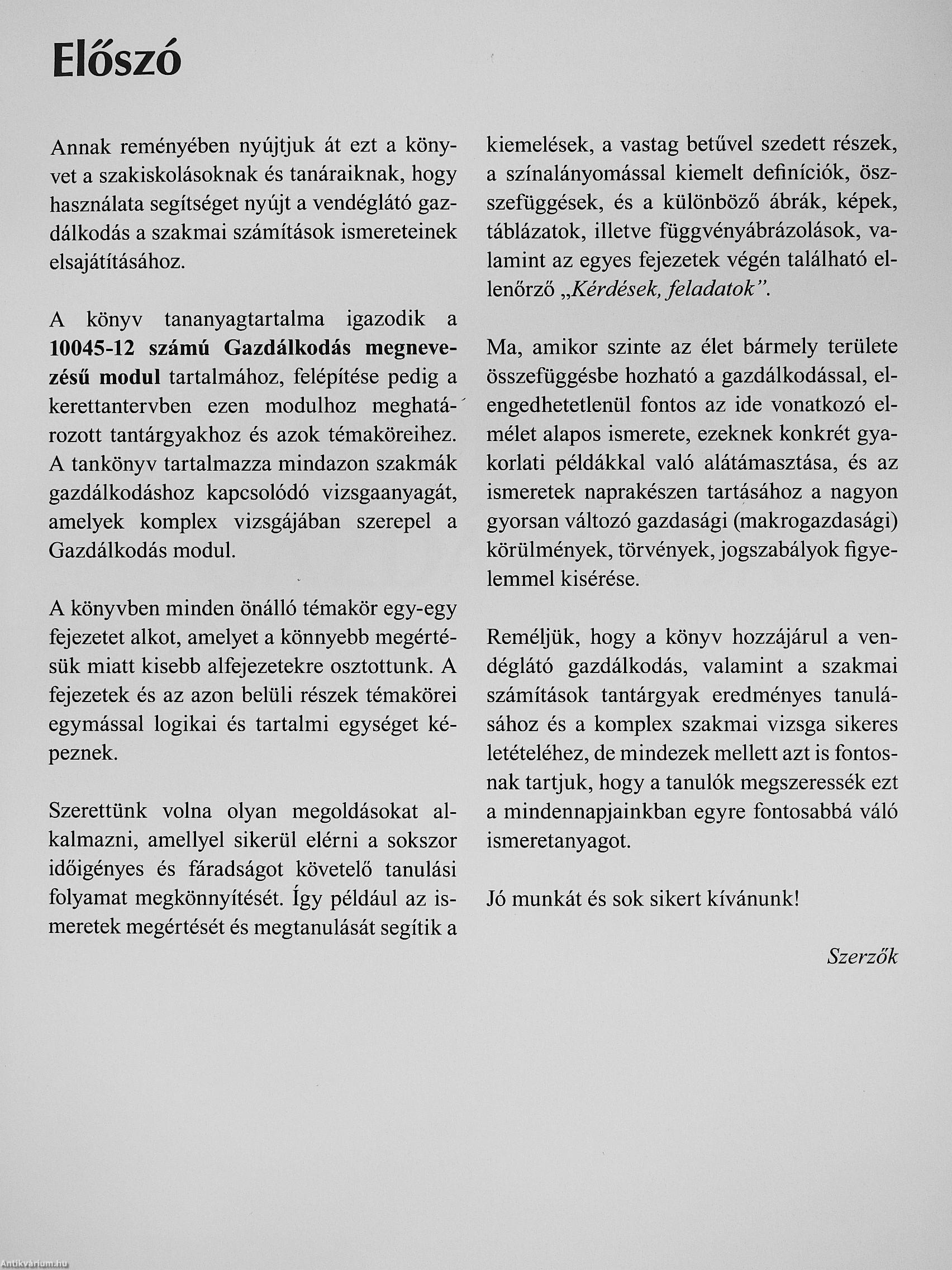 Remélhetőleg a könyv hozzájárul a vendéglátó gazdálkodás, valamint a szakmai számítások tantárgyak eredményes tanulásához és a komplex szakmai vizsga sikeres letételéhez.