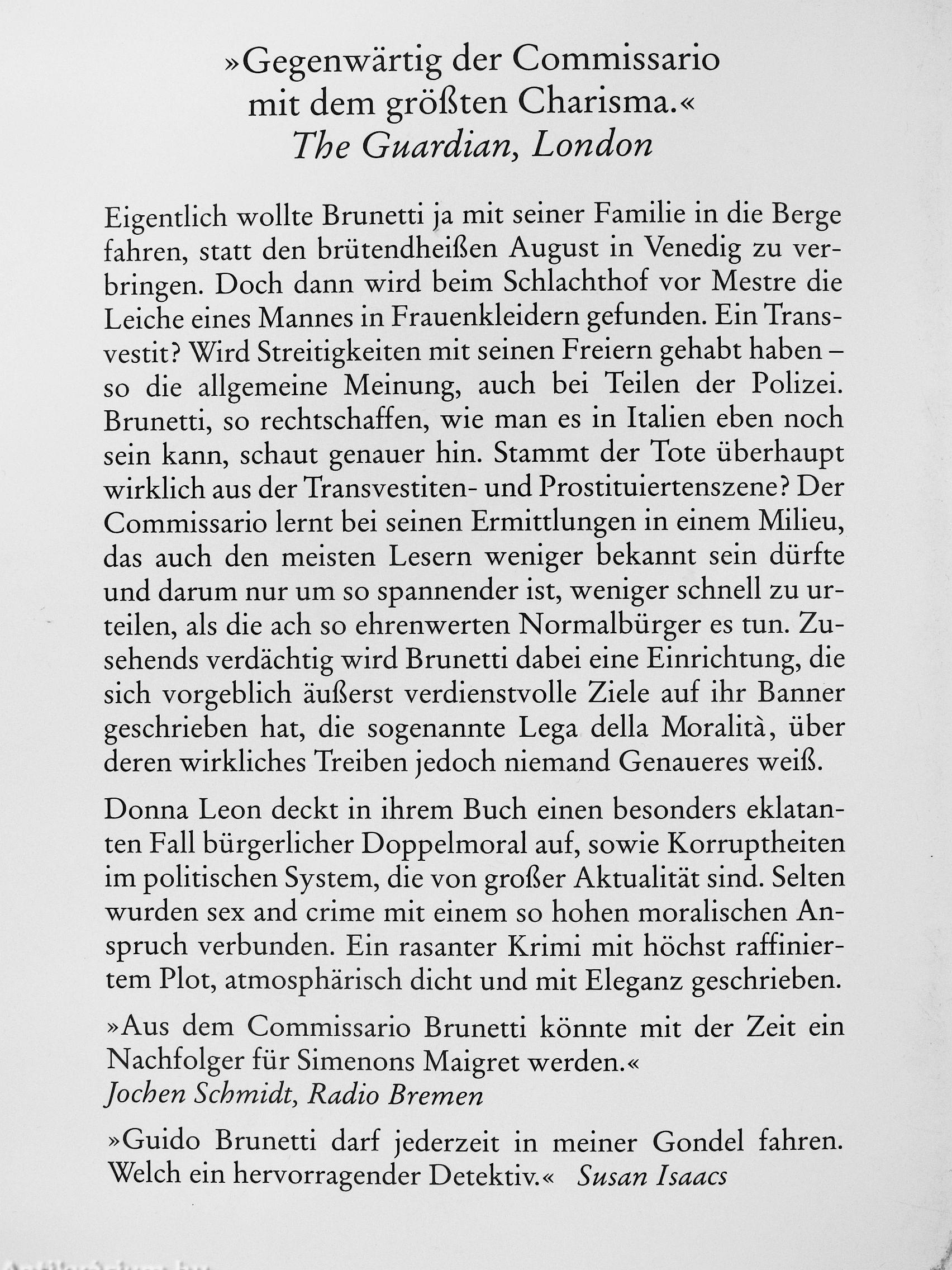 Eigentlich wollte Brunetti ja mit seiner Familie in die Berge fahren, statt den brütendheißen August in Venedig zu verbringen. Doch dann wird beim Schlachthof vor Mestre die Leiche eines Mannes in Frauenkleidern gefunden. Ein Trans-vestit? Wird Streitigkeiten mit seinen Freiern gehabt haben -so die allgemeine Meinung, auch bei Teilen der Polizei. Brunetti, so rechtschaffen, wie man es in Italien eben noch sein kann, schaut genauer hin. Stammt der Tote überhaupt wirklich aus der Transvestiten- und Prostituiertenszene? Der Commissario lernt bei seinen Ermittlungen in einem Milieu, das auch den meisten Lesern weniger bekannt sein dürfte und darum nur um so spannender ist, weniger schnell zu urteilen, als die ach so ehrenwerten Normalbürger es tun. Zusehends verdächtig wird Brunetti dabei eine Einrichtung, die sich vorgeblich äußerst verdienstvolle Ziele auf ihr Banner geschrieben hat, die sogenannte Lega della Moralita, über deren wirkliches Treiben jedoch niemand Genaueres weiß.