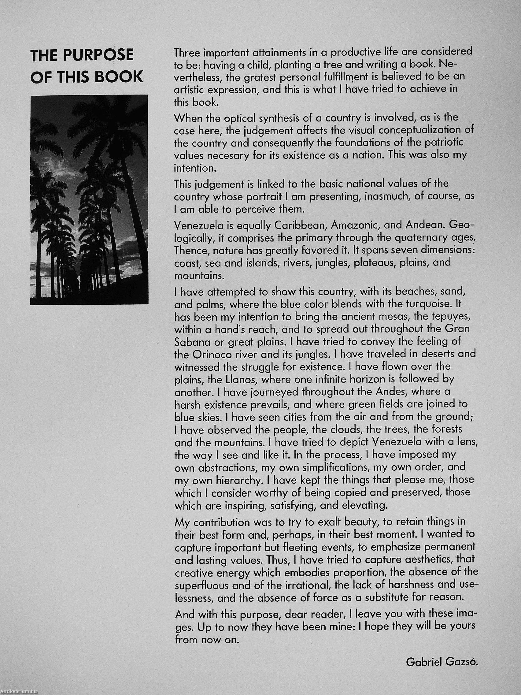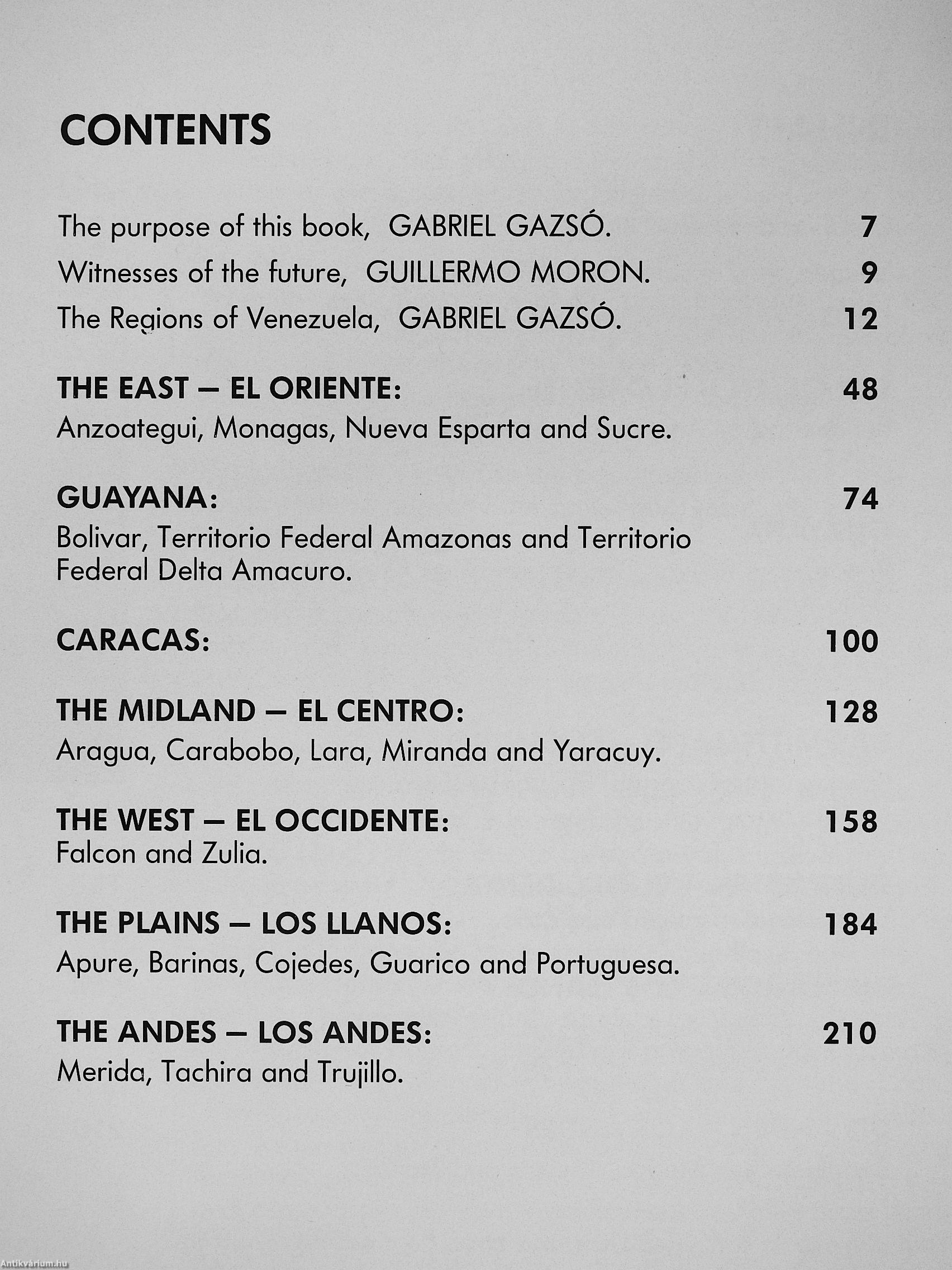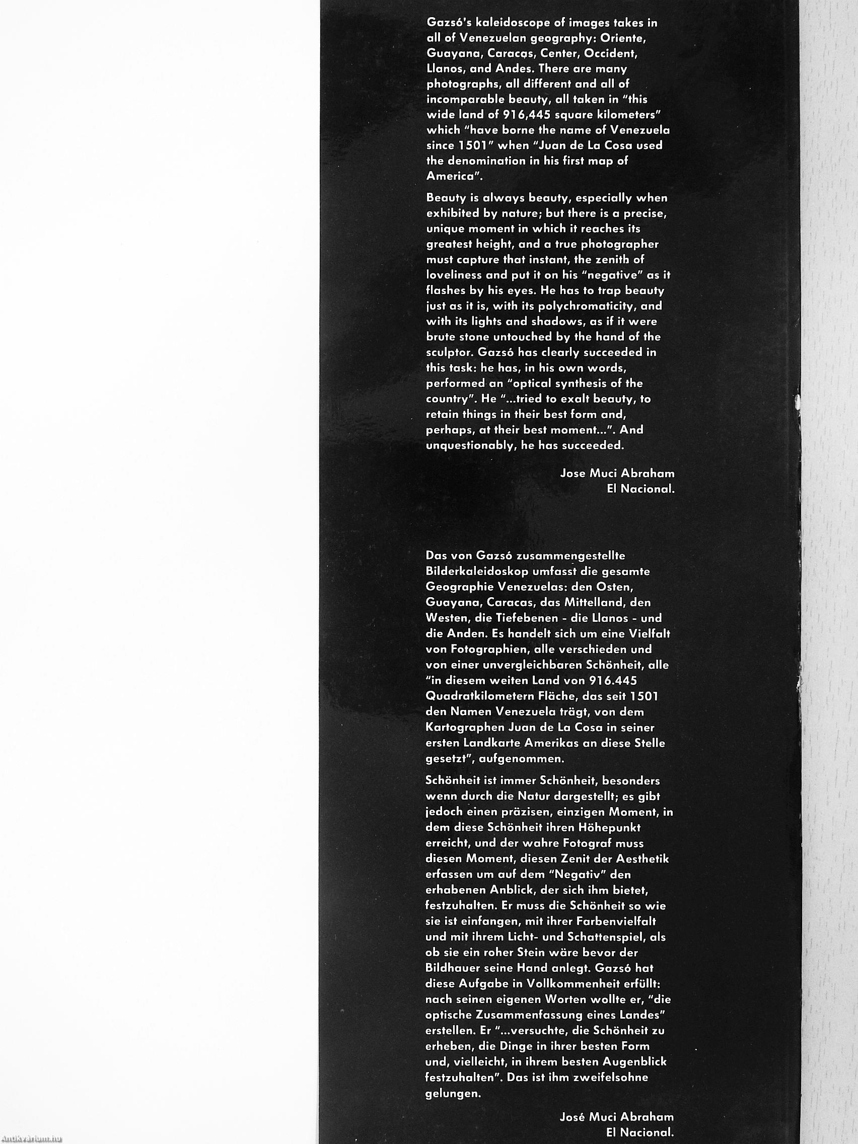Das von Gazsó zusammengestellte Bilderkaleidoskop umfasst die gesamte Geographie Venezuelas: den Osten, Guayana, Caracas, das Mittelland, den Westen, die Tiefebenen - die Llanos - und die Anden. Es handelt sich um eine Vielfalt von Fotographien, alle verschieden und von einer unvergleichbaren Schönheit, alle "in diesem weiten Land von 916.445 Quadratkilometern Fläche, das seit 1501 den Namen Venezuela trägt, von dem Kartographen Juan de La Cosa in seiner ersten Landkarte Amerikas an diese Stelle gesetzt", aufgenommen.