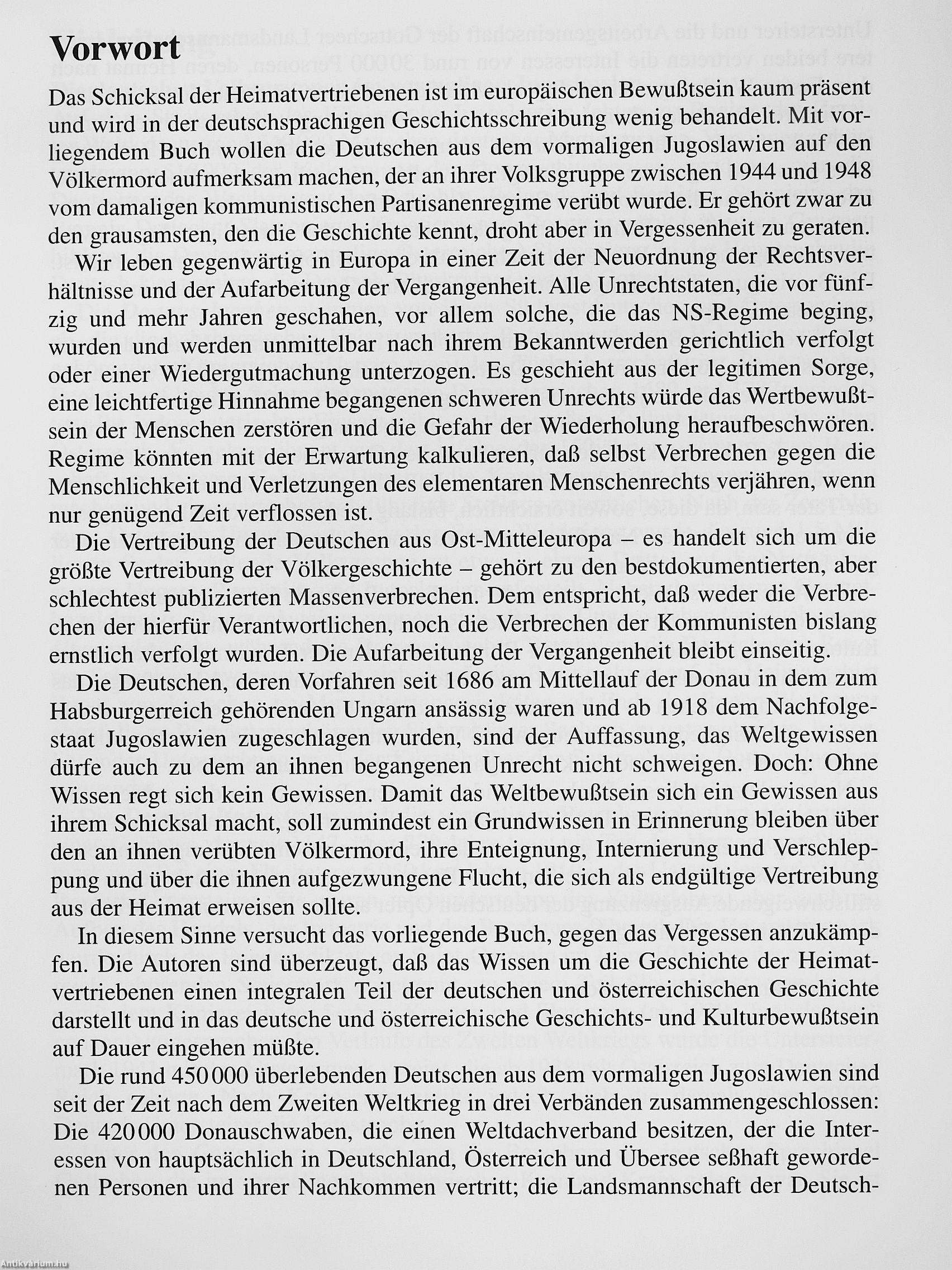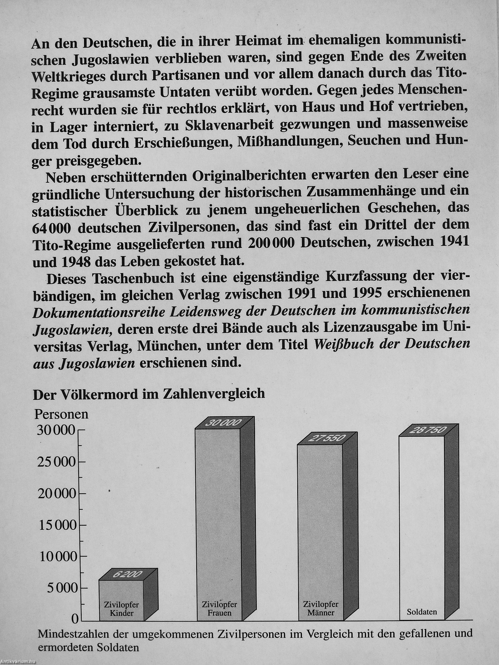 Dieses Taschenbuch ist eine eigenständige Kurzfassung der vierbändigen, im gleichen Verlag zwischen 1991 und 1995 erschienenen Dokumentationsreihe Leidensweg der Deutschen im kommunistischen Jugoslawien, deren erste drei Bände auch als Lizenzausgabe im Uni-versitas Verlag, München, unter dem Titel Weißbuch der Deutschen aus Jugoslawien erschienen sind.