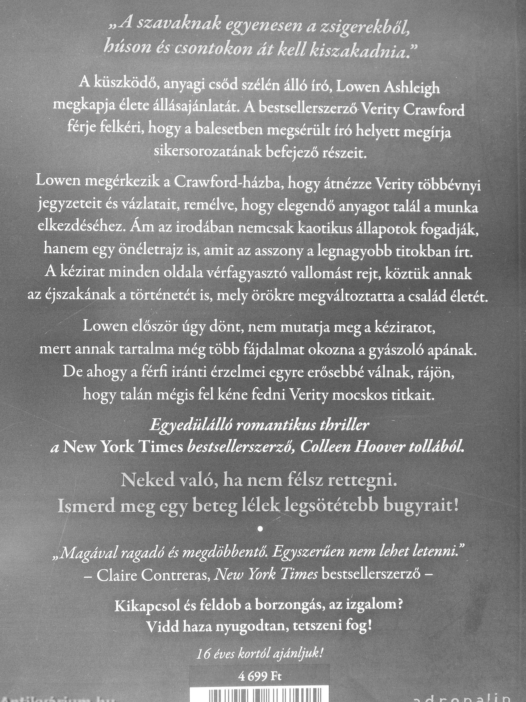 Egyedülálló romantikus thriller a New York Times bestsellerszerzö, Colleen Hoover tollából.