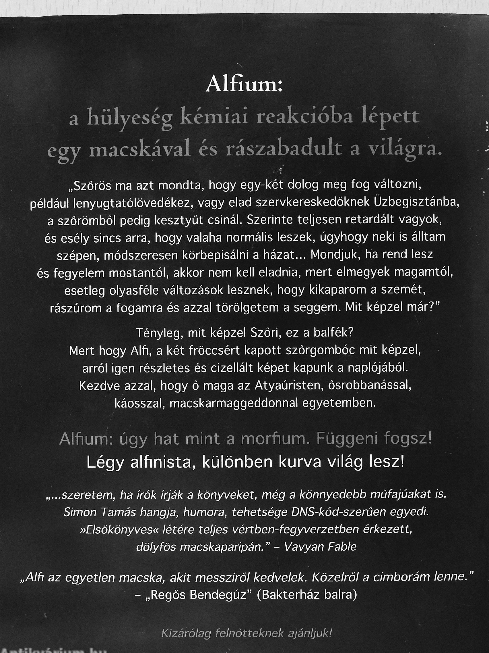 Tényleg, mit képzel Szőri, ez a balfék? Mert hogy Alfi, a két fröccsért kapott szőrgombóc mit képzel, arról igen részletes és cizellált képet kapunk a naplójából. Kezdve azzal, hogy ő maga az Atyaúristen, ősrobbanással, káosszal, macskarmaggeddonnal egyetemben.