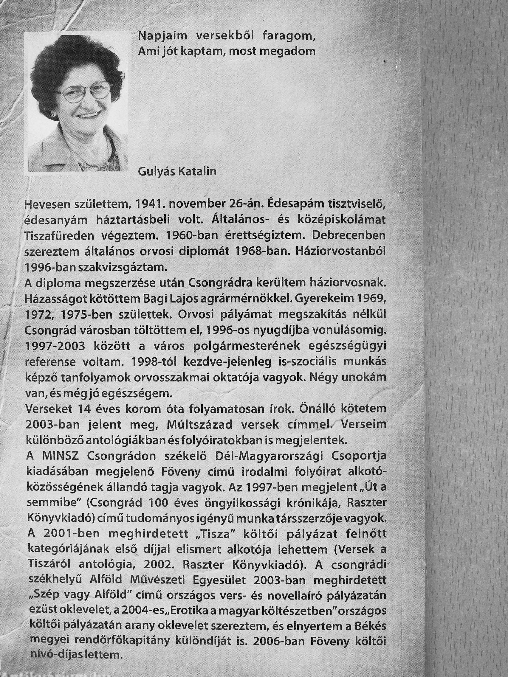 Verseket 14 éves korom óta folyamatosan írok. Önálló kötetem 2003-ban Jelent meg. Múltszázad versek címmel. Verseim különböző antológiákban és folyóiratokban is megjelentek. A MINSZ... Tovább