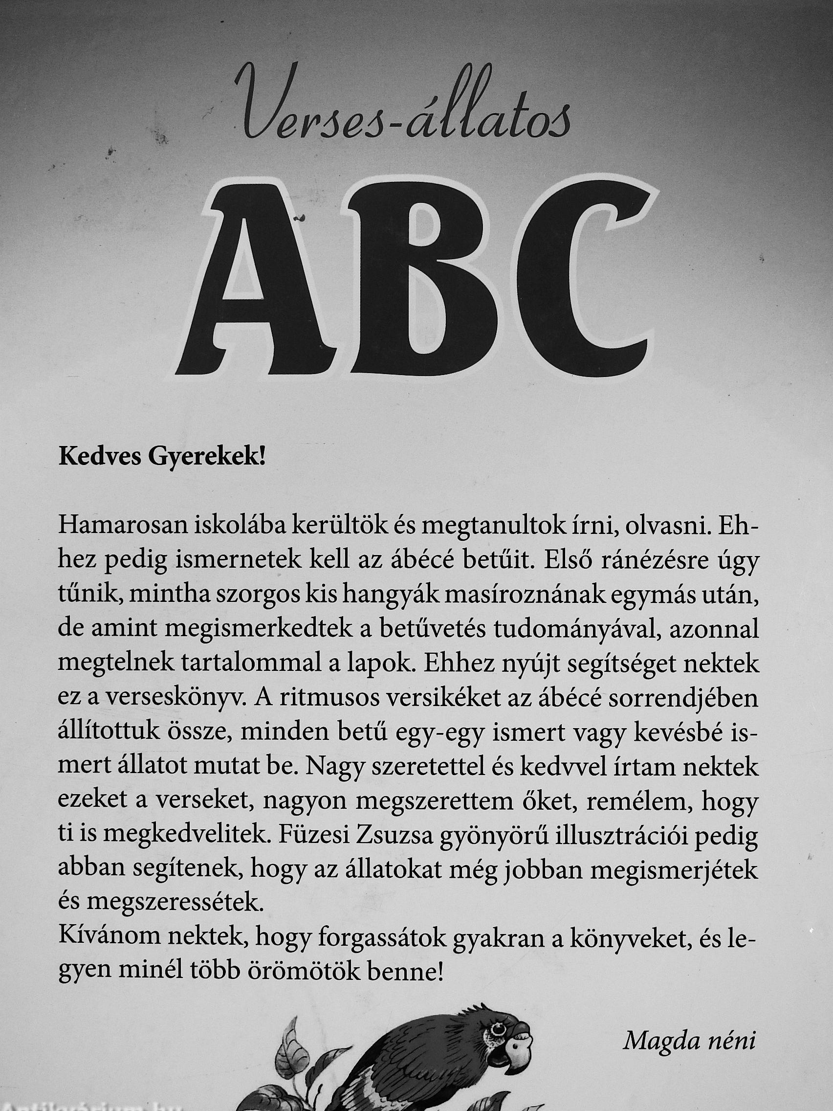 Hamarosan iskolába kerültök és megtanultok írni, olvasni. Ehhez pedig ismernetek kell az ábécé betűit. Első ránézésre úgy tűnik, mintha szorgos kis hangyák masíroznának egymás után, de amint megismerkedtek a betűvetés tudományával, azonnal megtelnek tartalommal a lapok. Ehhez nyújt segítséget nektek ez a verseskönyv. A ritmusos versikéket az ábécé sorrendjében állítottuk össze, minden betű egy-egy ismert vagy kevésbé ismert állatot mutat be. Nagy szeretettel és kedvvel írtam nektek ezeket a verseket, nagyon megszerettem őket, remélem, hogy ti is megkedvelitek. Füzesi Zsuzsa gyönyörű illusztrációi pedig abban segítenek, hogy az állatokat még jobban megismerjétek és megszeressétek.
