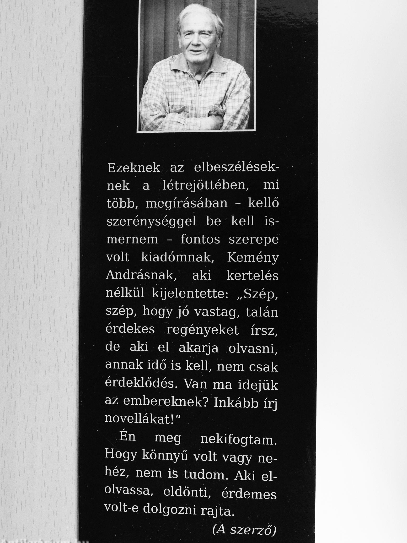 Ezeknek az elbeszéléseknek a létrejöttében, mi több, megírásában - kellő szerénységgel be kell ismernem - fontos szerepe volt kiadómnak. Kemény Andrásnak, aki kertelés nélkül kijelentette: „Szép, szép, hogy jó vastag, talán érdekes regényeket írsz, de aki el akarja olvasni, annak idő is kell, nem csak érdeklődés. Van ma idejük az embereknek? Inkább írj novellákat!"