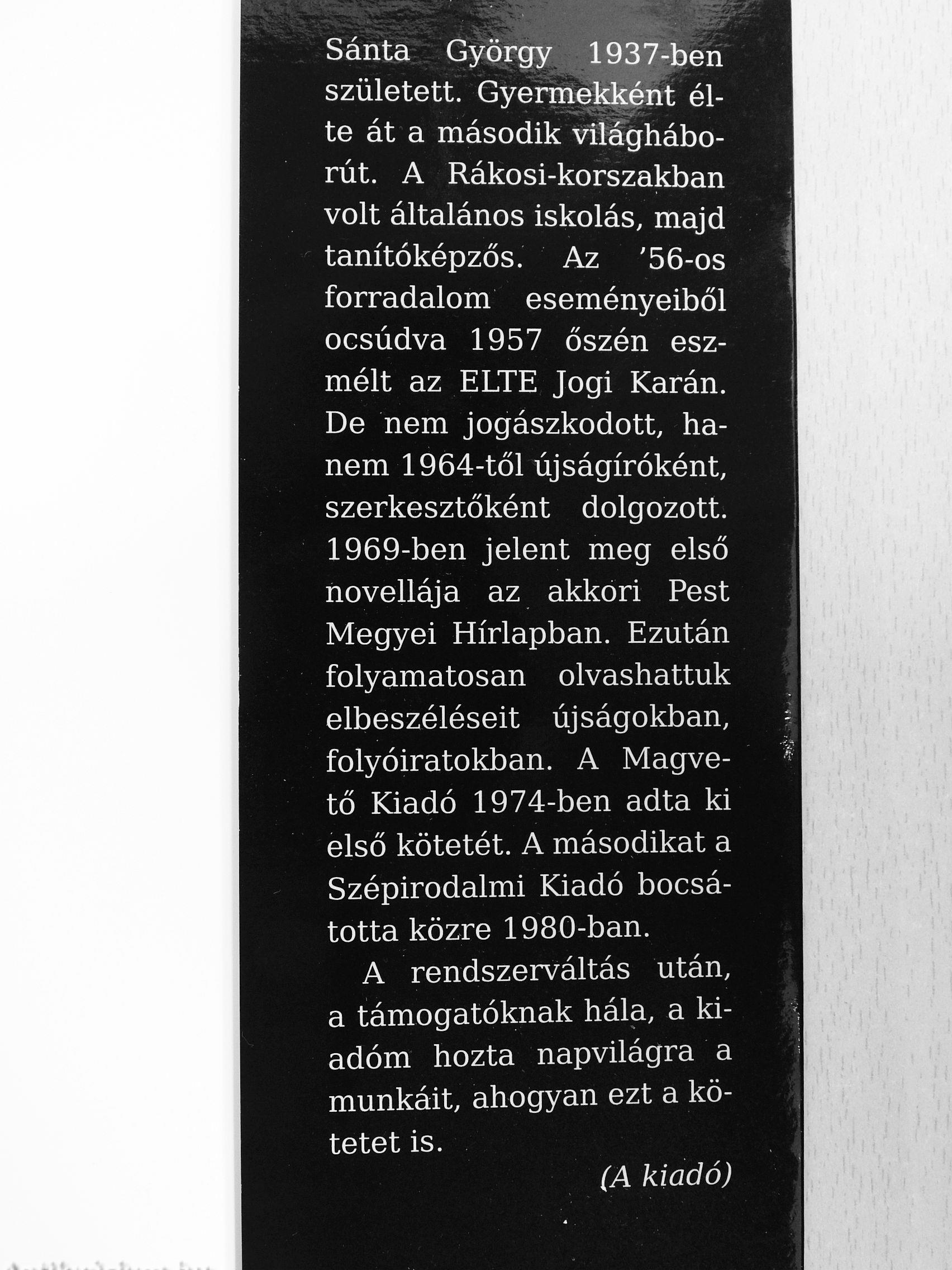 Sánta Györ# 1937-ben született. Gyerm^^át élte át a második viíaghábo-rút. A Rákosi-korszakban volt általános iskolás, majd tanítóképzős. Az '56-os forradalom eseményeiből ocsúdva 1957 őszén eszmélt az ELTE Jogi Karán. De nem jogászkodott, hanem 1964-től újságíróként, szerkesztőként dolgozott. 1969-ben jelent meg első novellája az akkori Pest Megyei Hírlapban. Ezután folyamatosan olvashattuk elbeszéléseit újságokban, folyóiratokban. A Magvető Kiadó 1974-ben adta ki első kötetét. A másodikat a Szépirodalmi Kiadó bocsátotta közre 1980-ban.