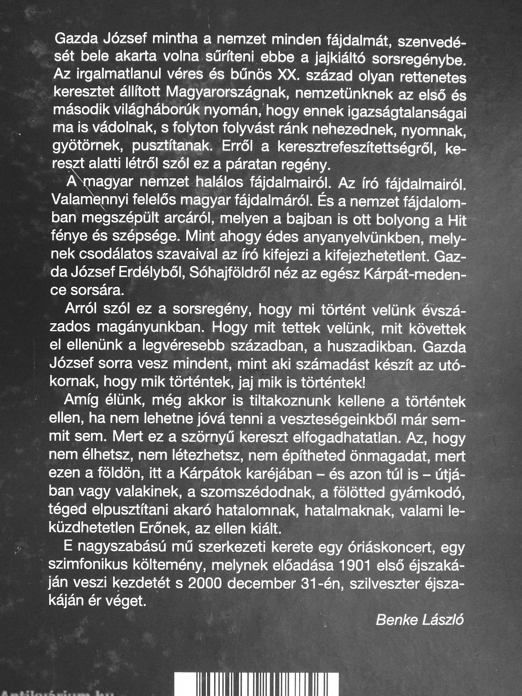 Gazda József mintha a nemzet minden fájdalmát, szenvedését bele akarta volna sűríteni ebbe a jajkiáltó sorsregénybe. Az irgalmatlanul véres és bűnös XX. század olyan rettenetes keresztet állított Magyarországnak, nemzetünknek az első és második világháborúk nyomán, hogy ennek igazságtalanságai ma is vádolnak, s folyton folyvást ránk nehezednek, nyomnak, gyötörnek, pusztítanak. Erről a keresztrefeszítettségről, kére^ alatti létről szól ez a páratan regény.